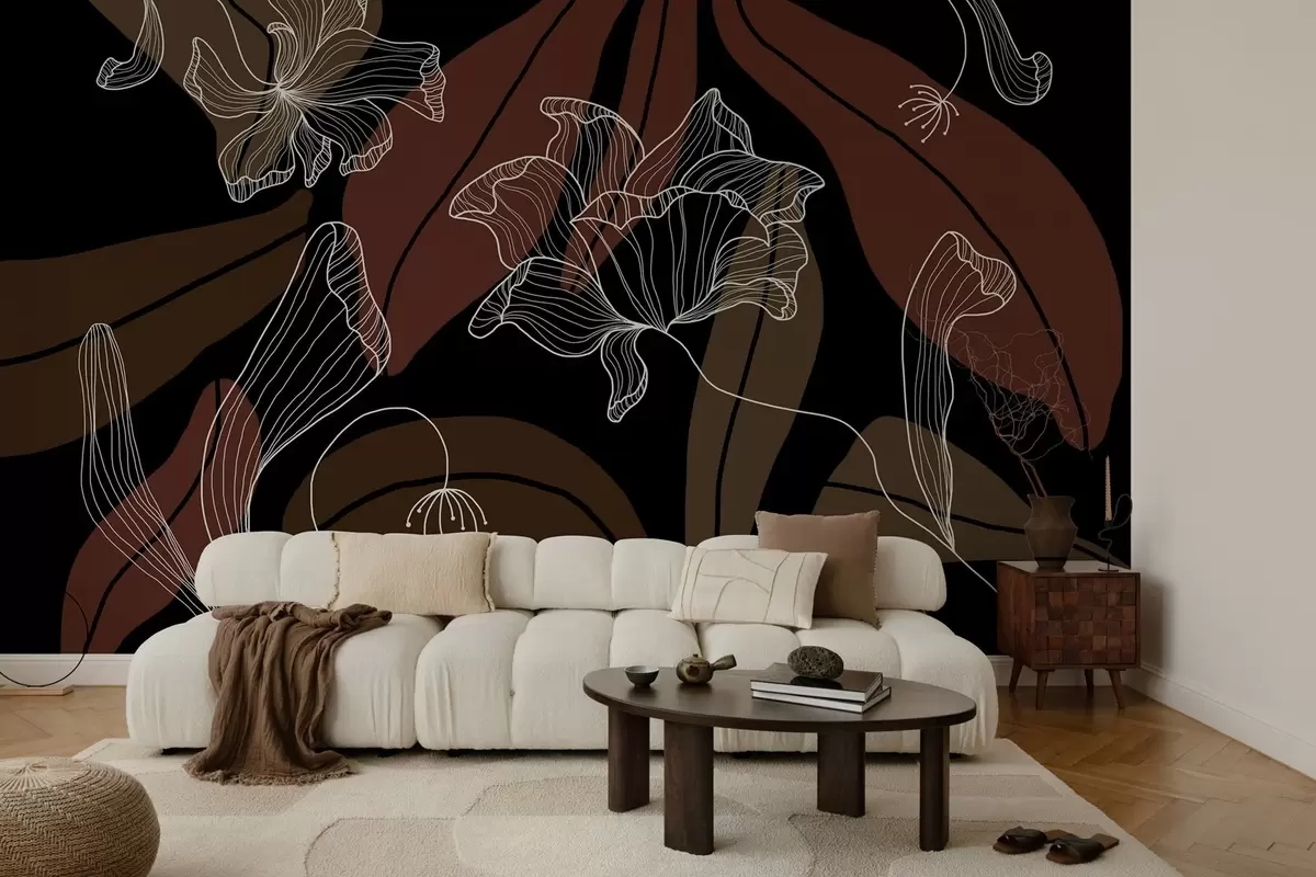 Wall murals abstract leaves and flowers in powdery and beige tones on a dark background Nr. w04499v3