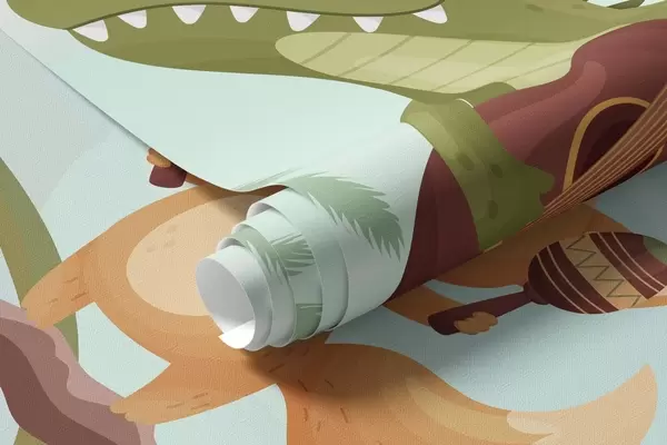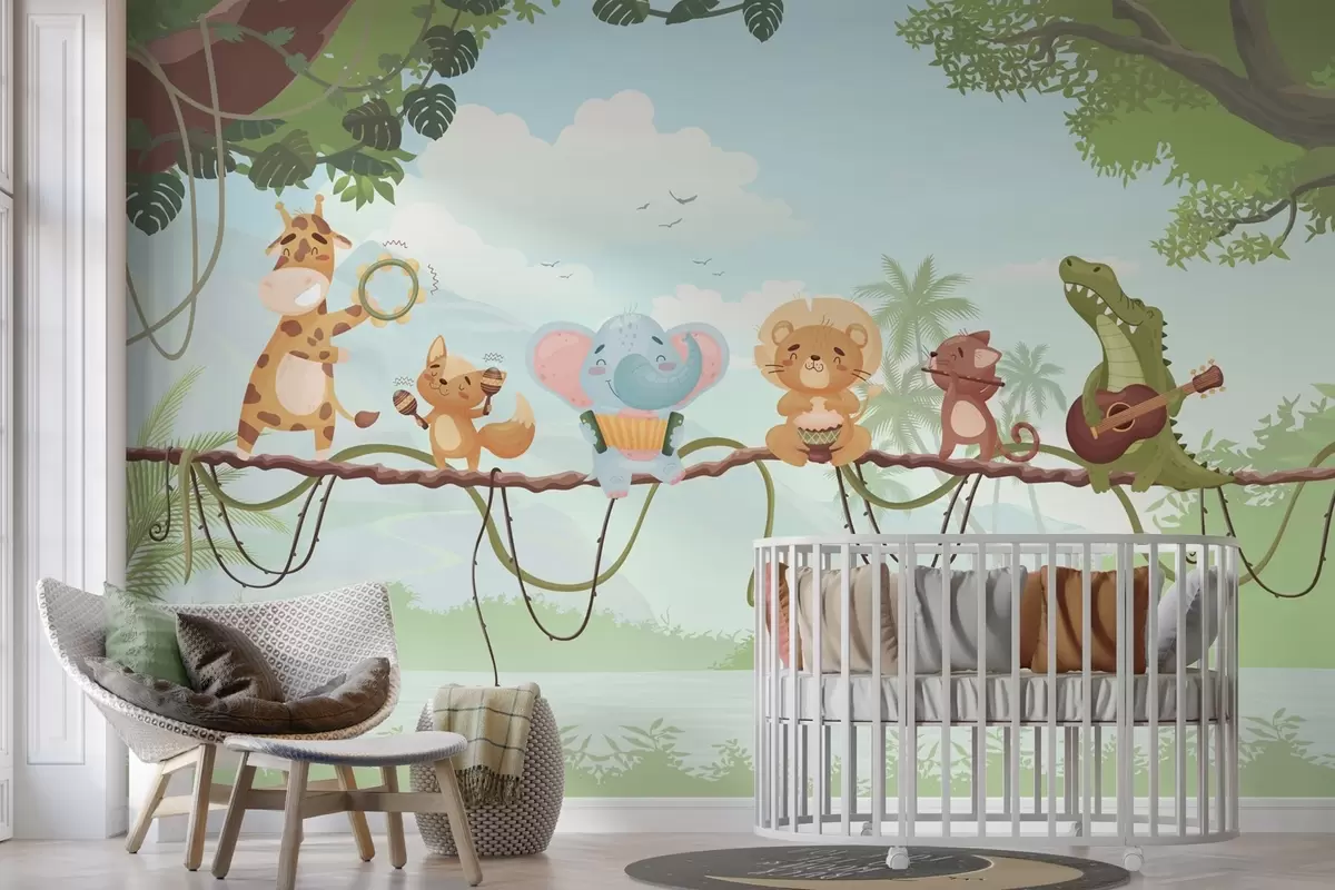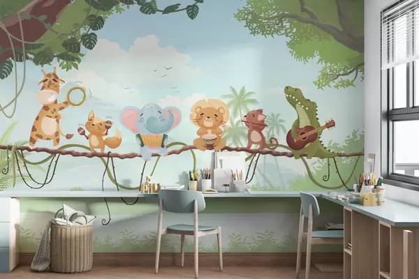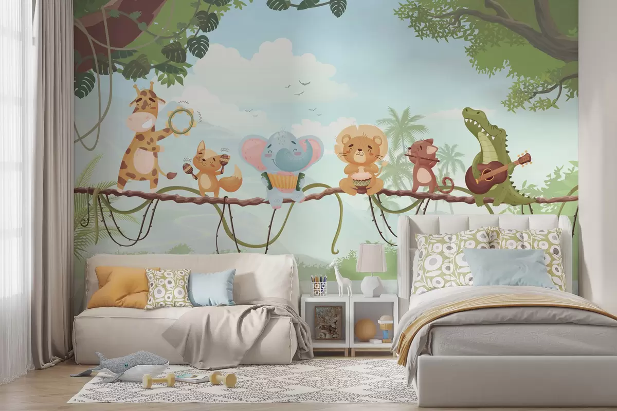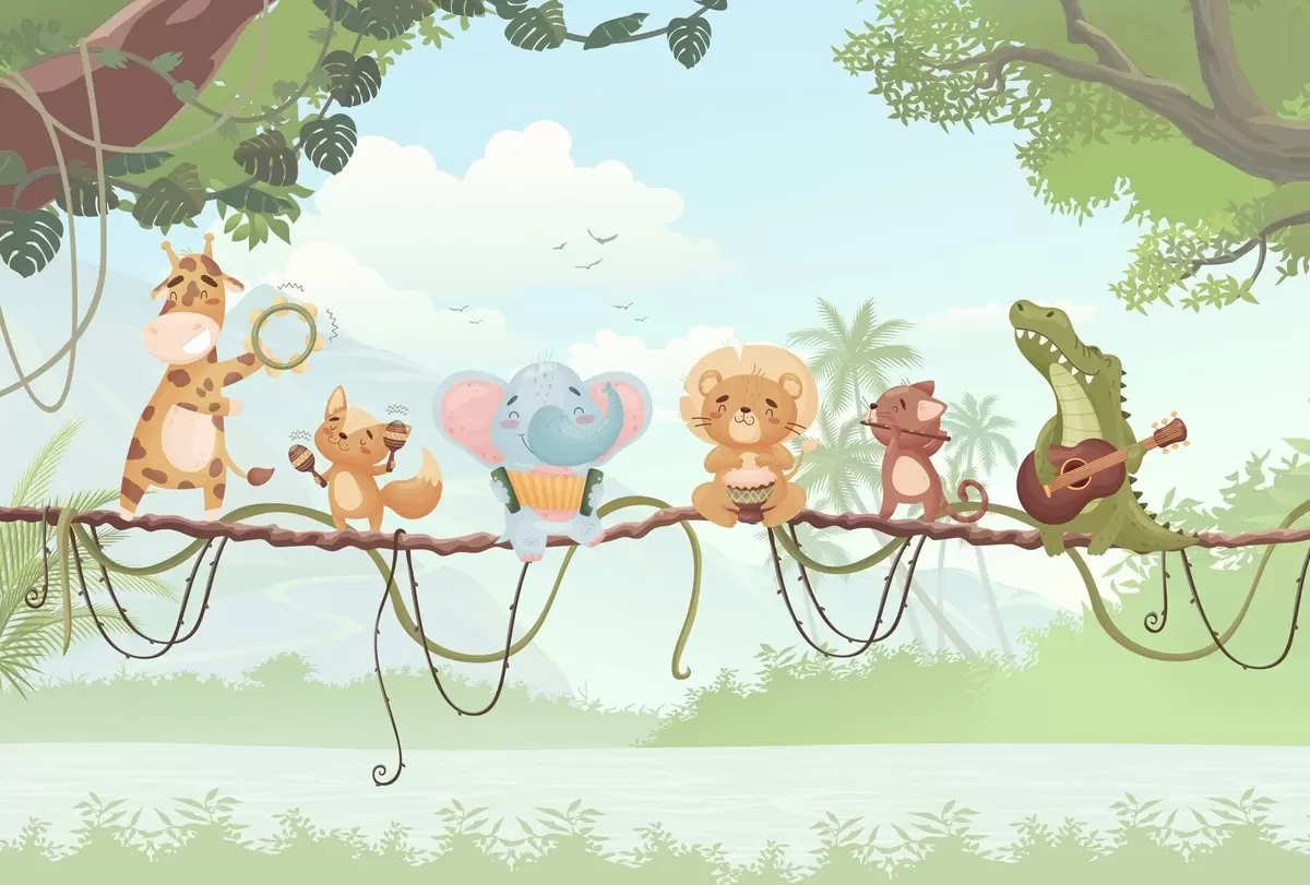 Wall murals Animals with musical instruments against a tropical landscape Nr. w04505