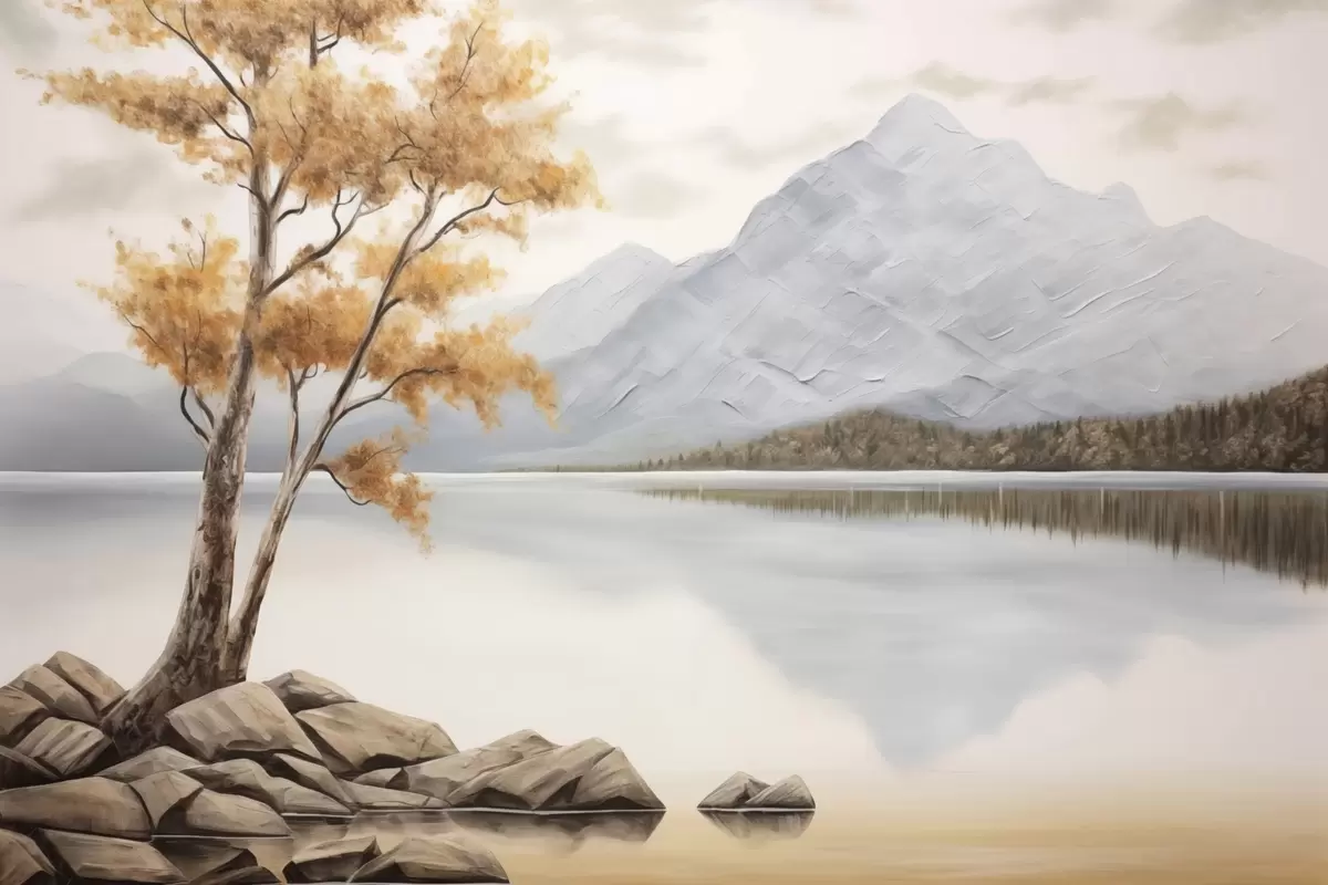 wall murals Autumn tree by a mountain lake, calm pastels w04611