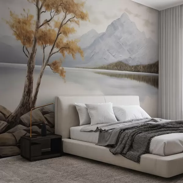 Wall murals Autumn tree by a mountain lake, calm pastels Nr. w04611