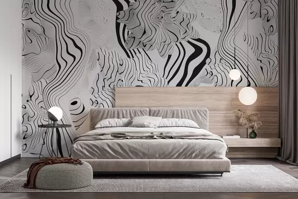 Wall murals abstract organic shapes in 3D style in white and grey tones with black stripes Nr. w04627