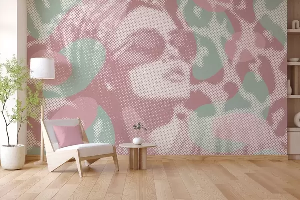 Wall murals portrait of a woman on a leopard background in a dotted style in pink and green tones Nr. w04630v2