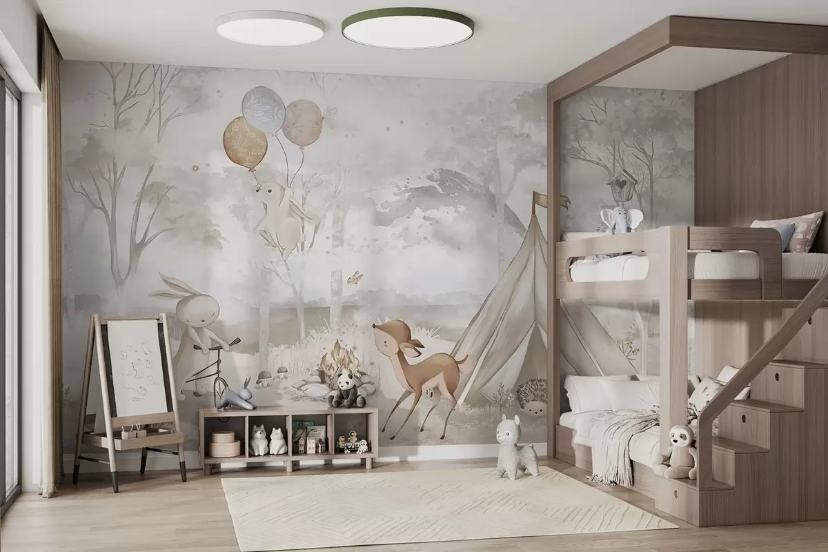 Wall murals Kids' camp in warm beige tones, tent and forest animals Nr. w04671