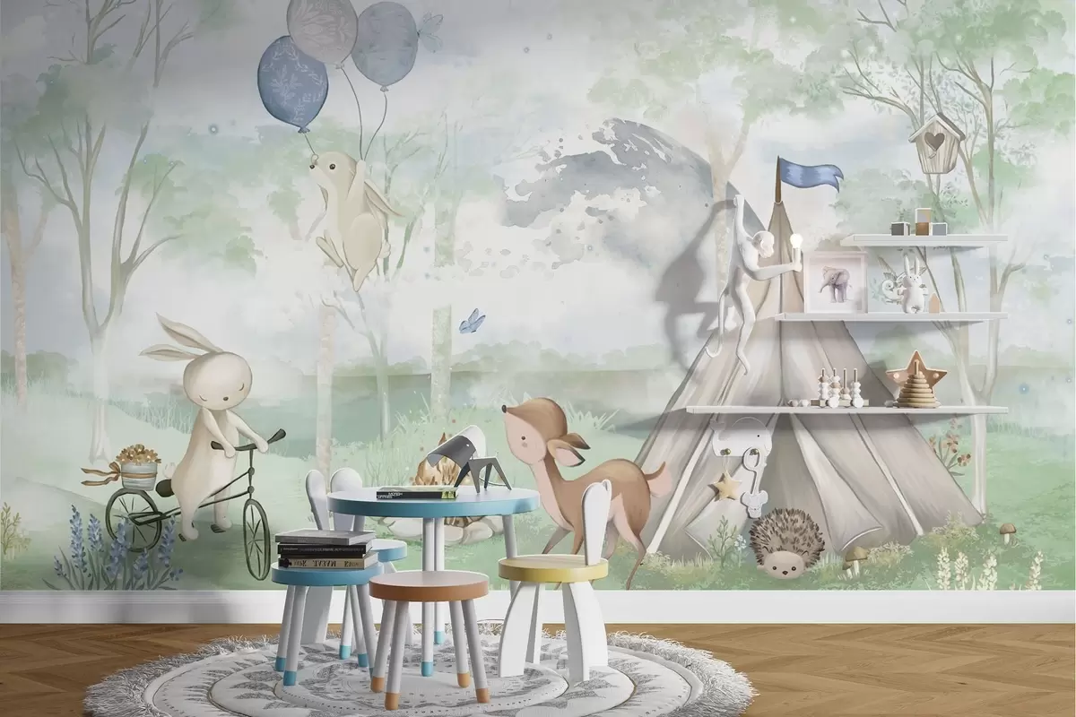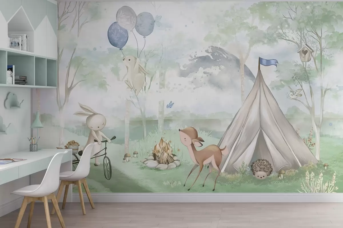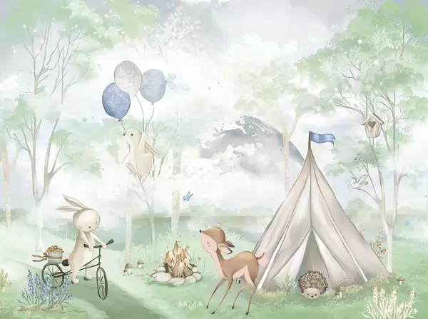 Wall murals Kids' forest camp: bunnies, fawn, tent and campfire Nr. w04671v1