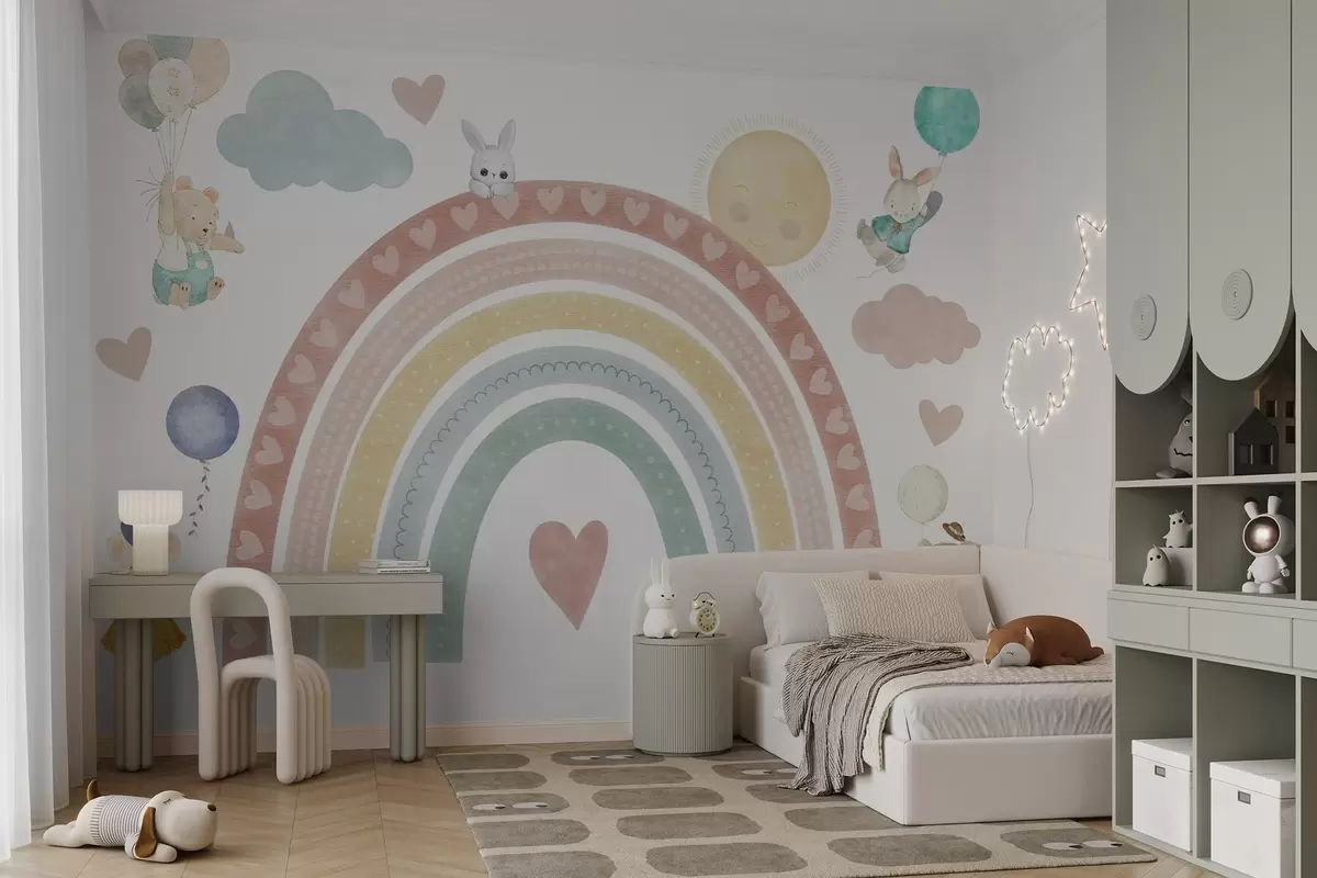 Wall murals Pastel rainbow with hearts, animals and balloons Nr. w04681