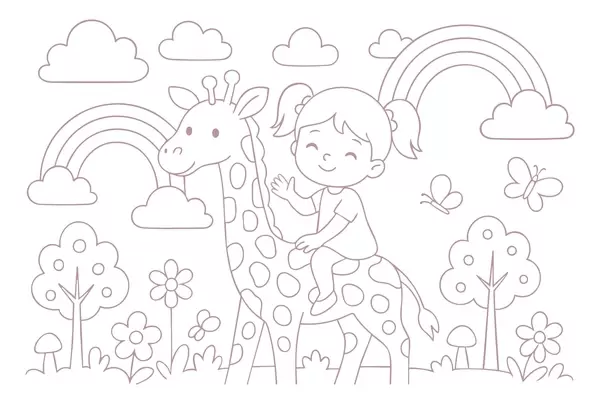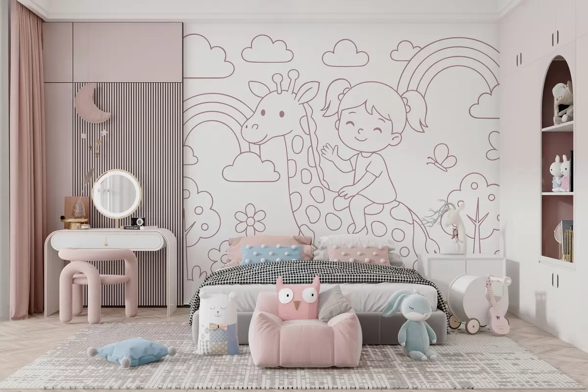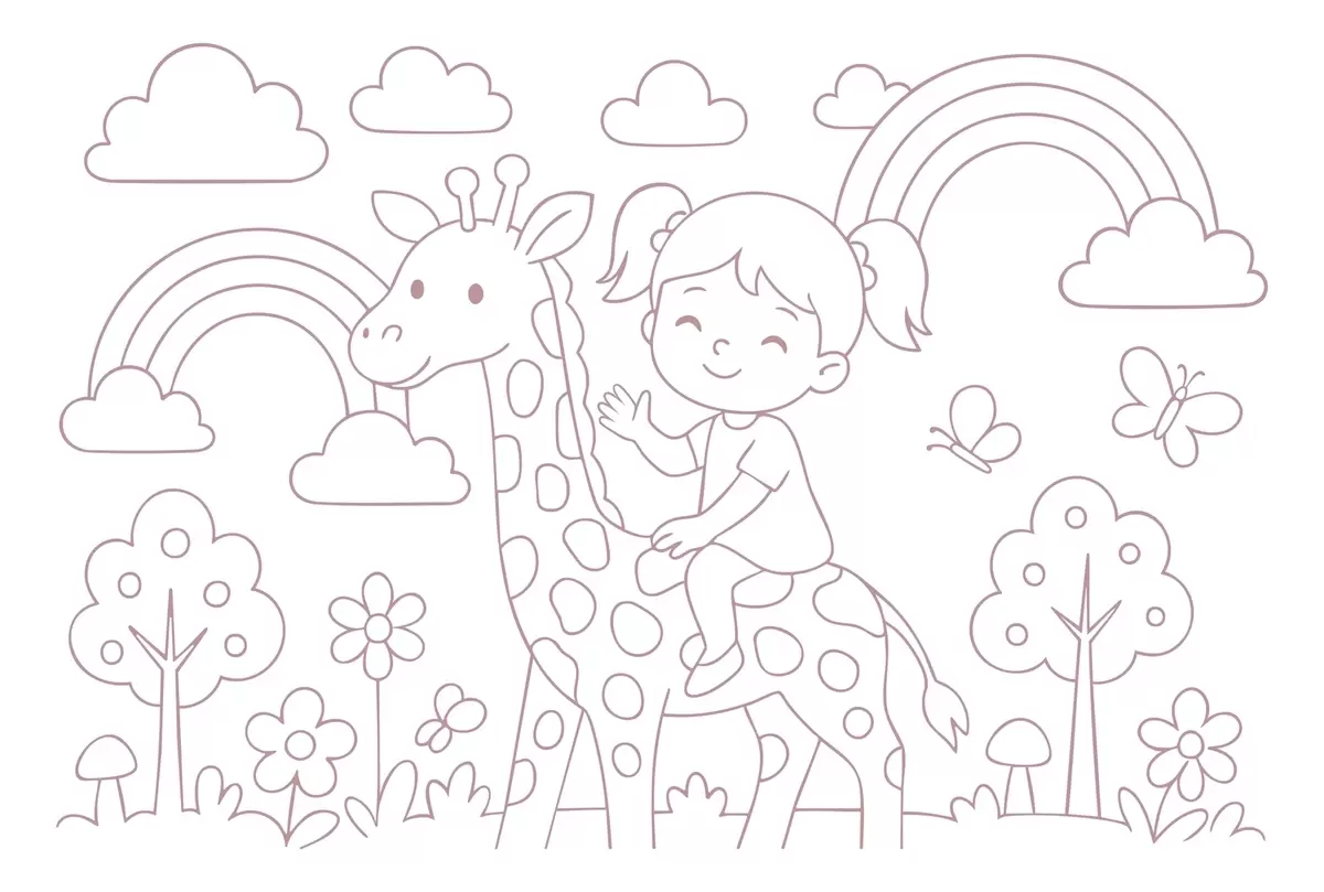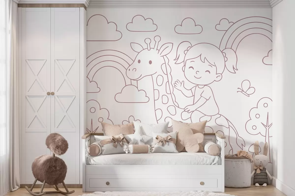 Wall murals powder painting of a girl on a giraffe in the style of a children's colouring book Nr. w04753v1