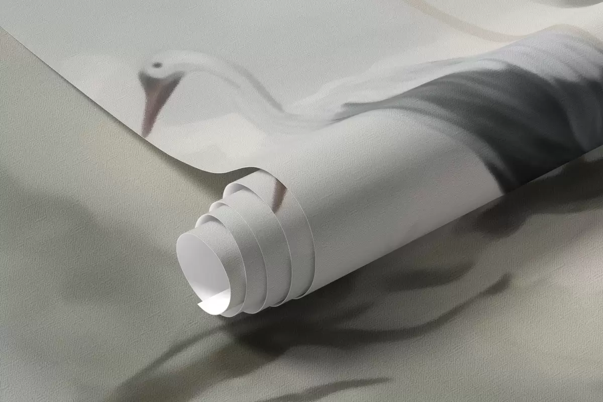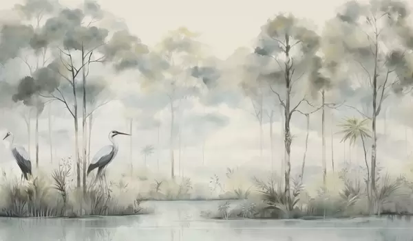 Wall murals Misty forest by the water with herons, soft cool palette Nr. w04788