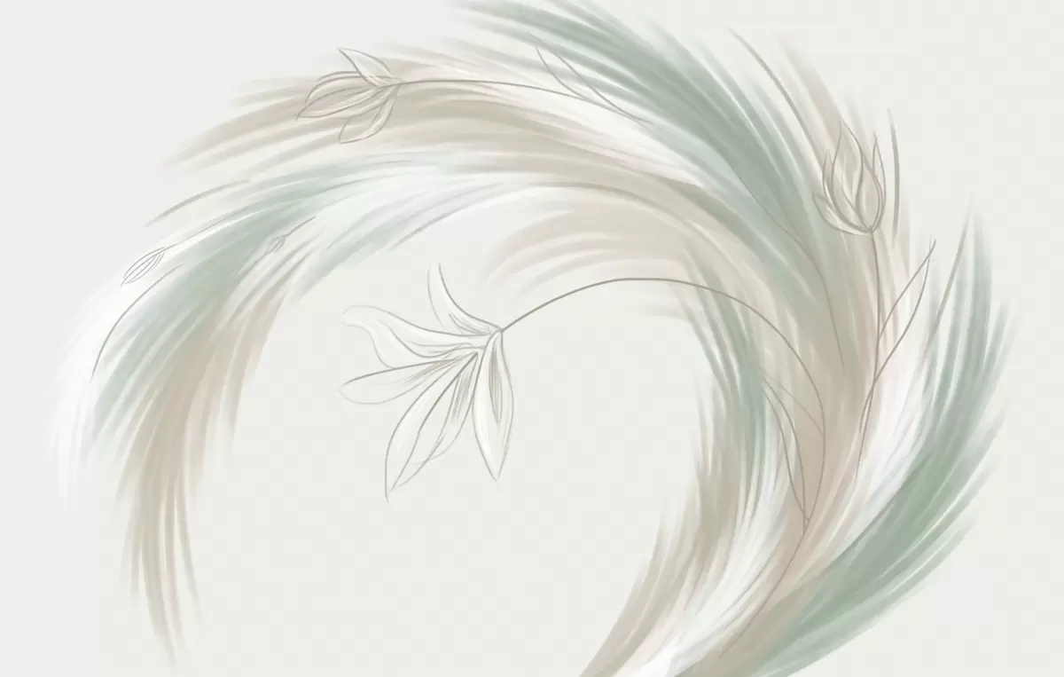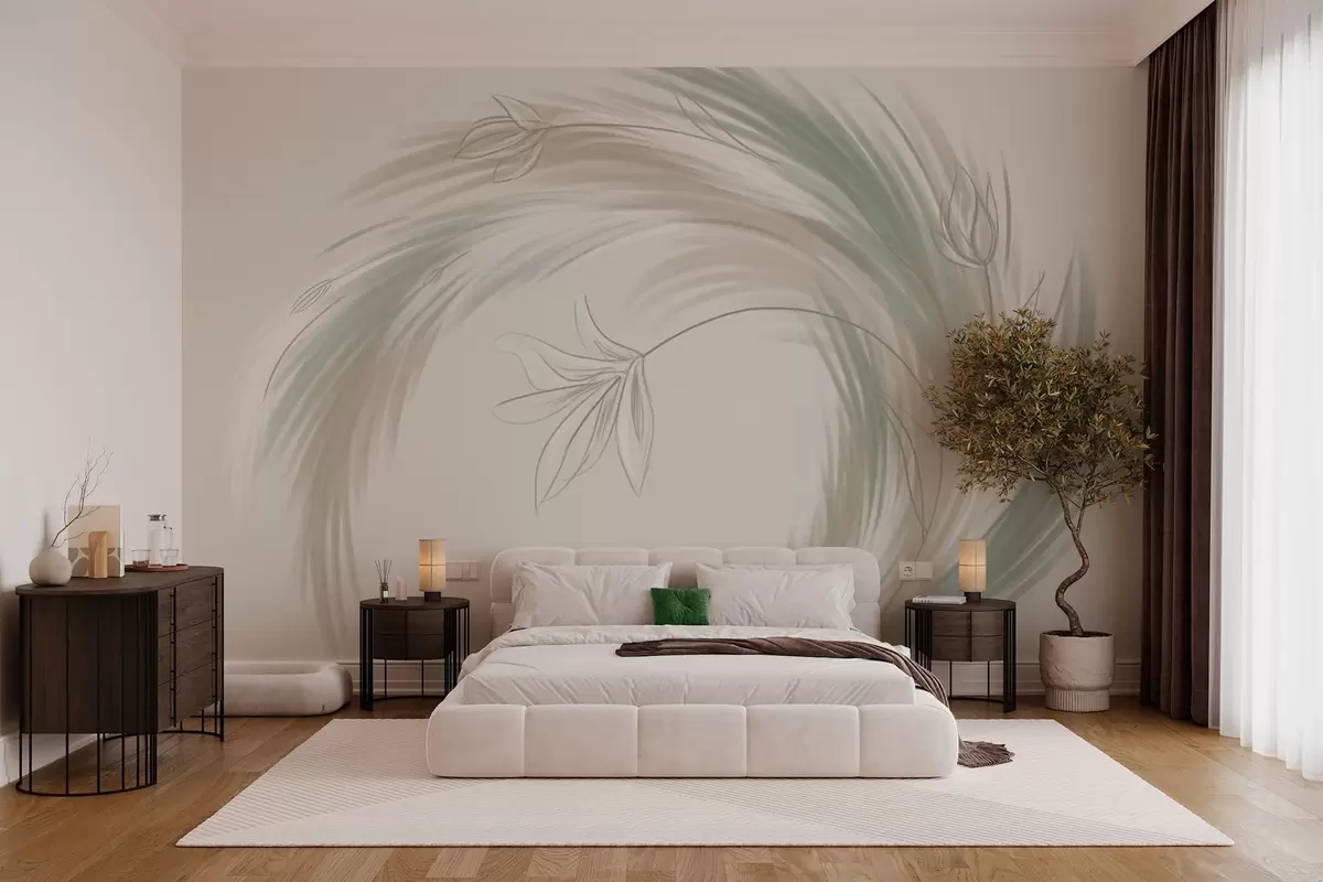 Wall murals green and beige feathers and flowers, hand-painted Nr. w04816
