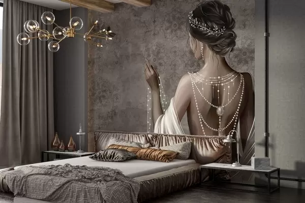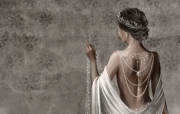 Wall murals Woman seen from behind with pearls, gray stone-patterned backdrop Nr. w04854