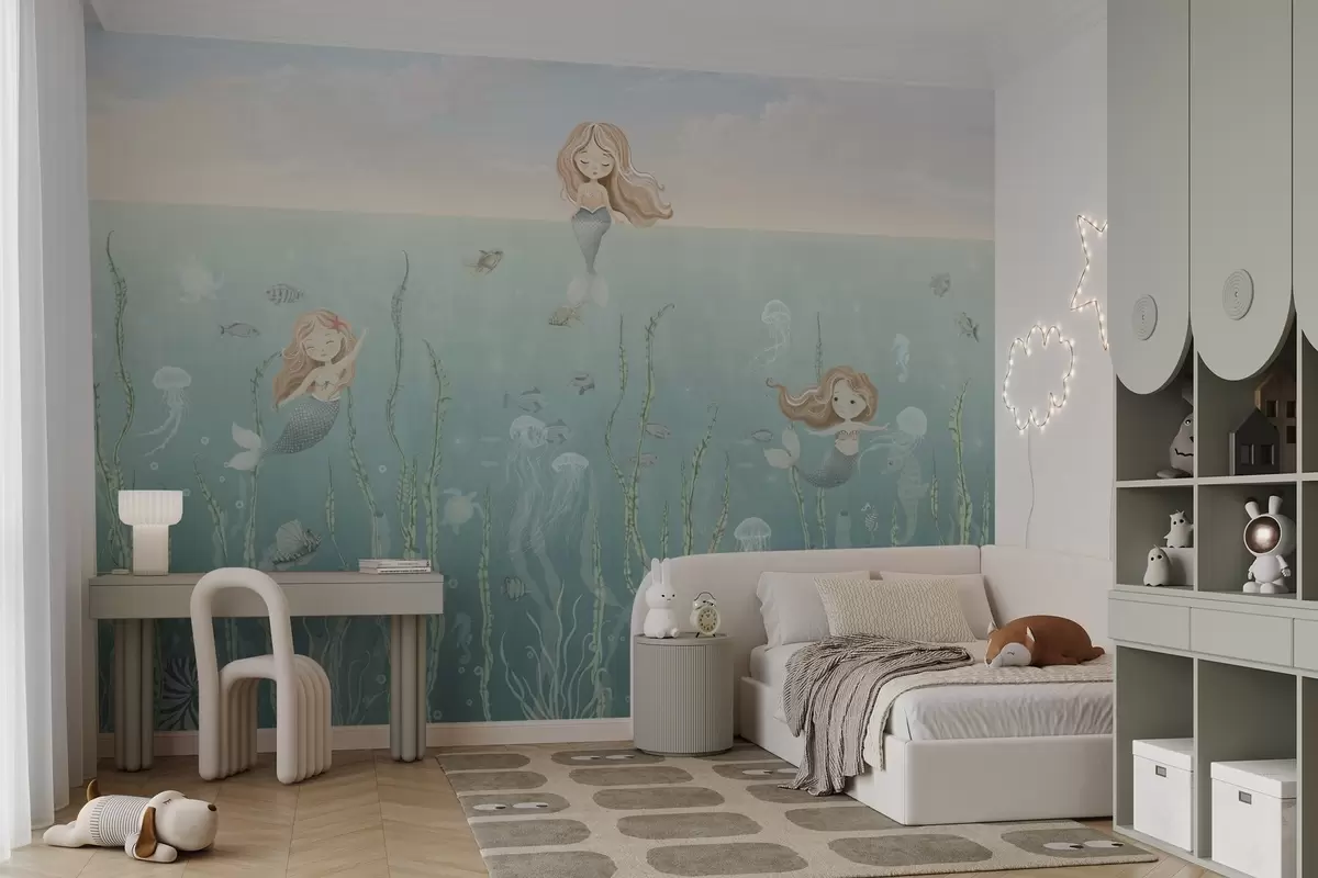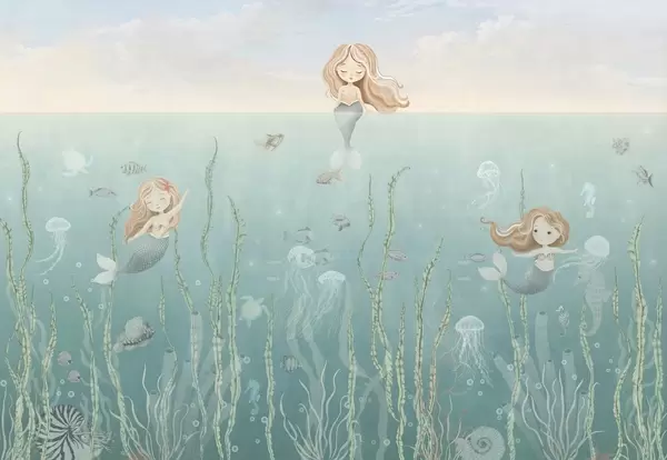 Wall murals Playful mermaids undersea with seaweed, jellyfish and fish Nr. w04860