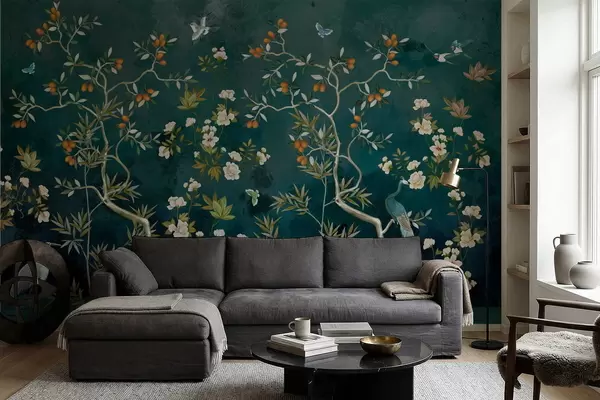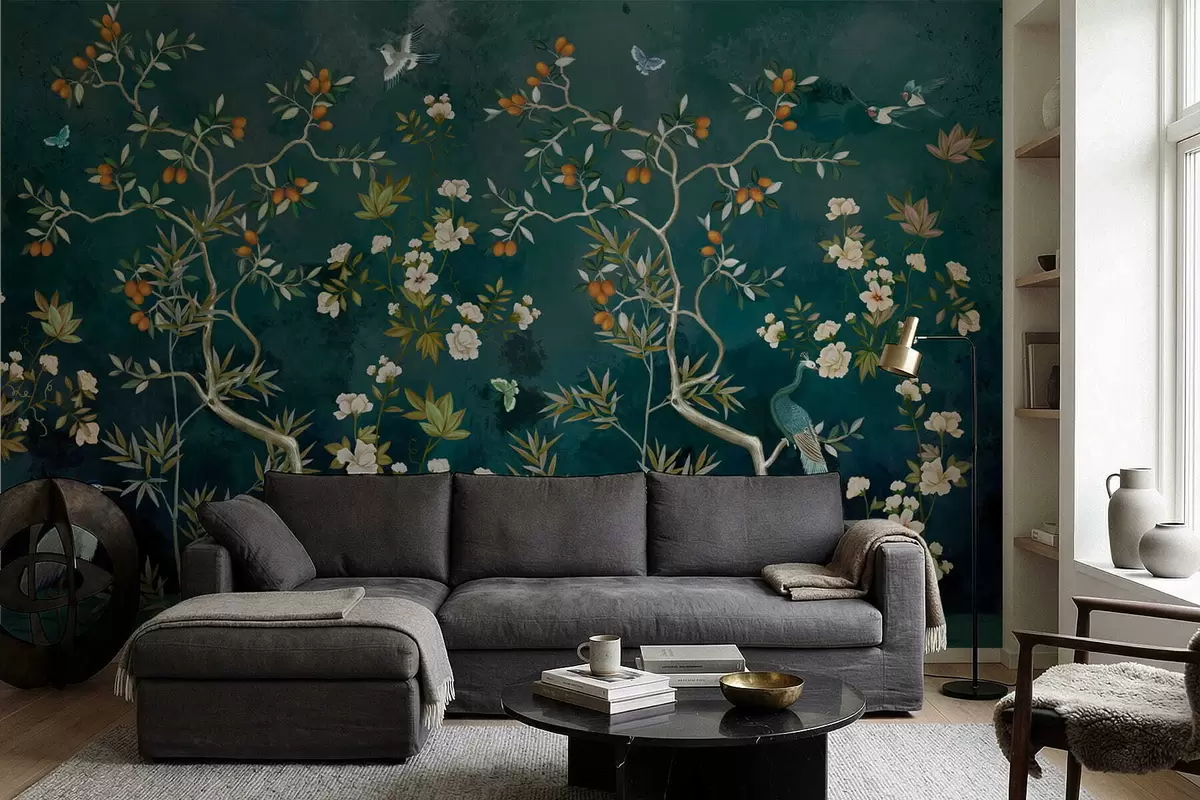 Wall murals Decorative scene with trees, flowers and birds on dark background Nr. w05004