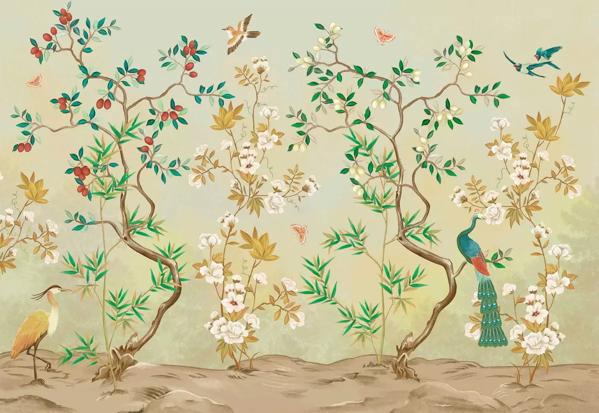 Wall murals Scene with trees, flowers and birds, light background Nr. w05004v1