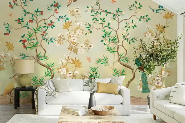 Wall murals Scene with trees, flowers and birds, light background Nr. w05004v1