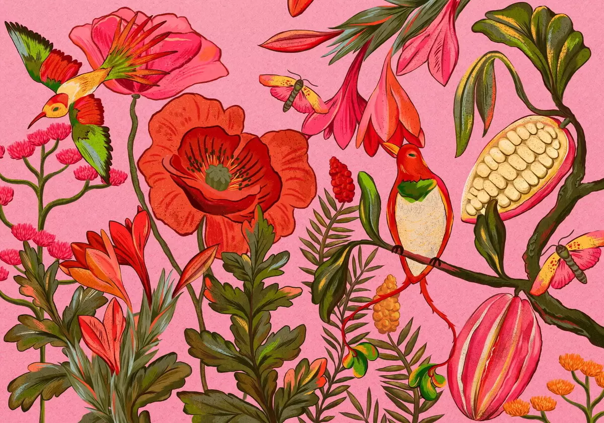 Wall murals Decorative flowers and birds on pink background Nr. w05036v2
