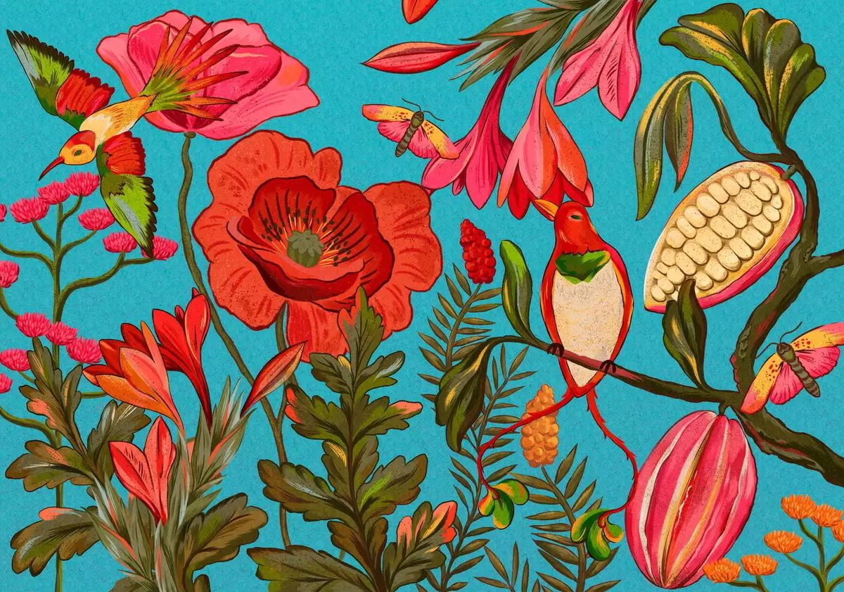 Wall murals Decorative flowers and birds on blue background Nr. w05036v3