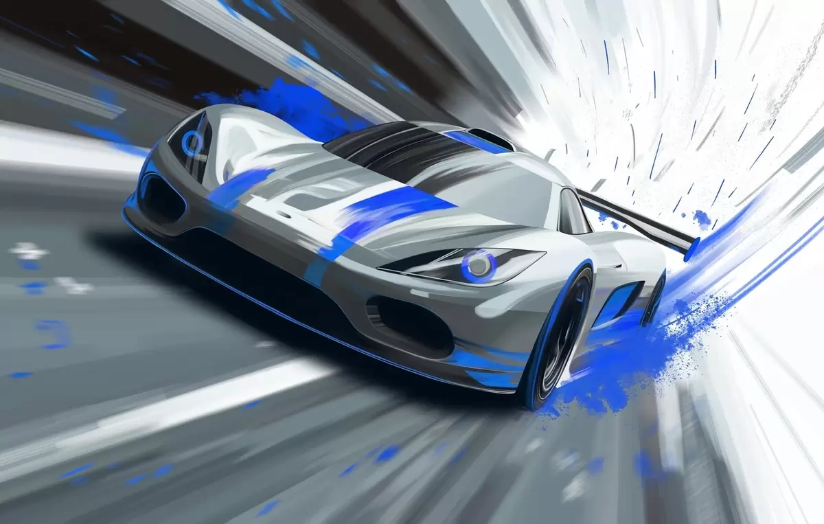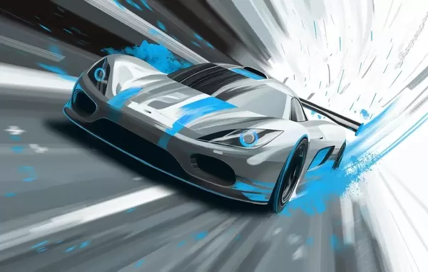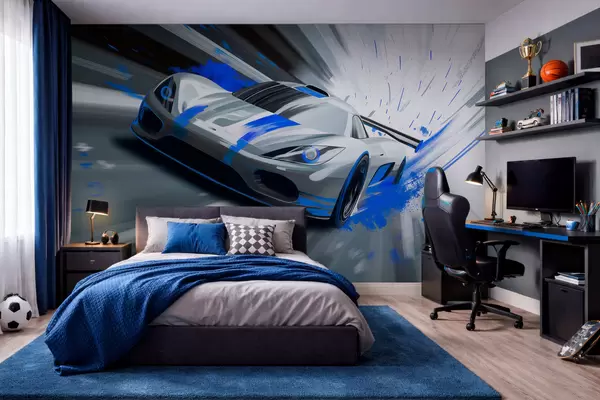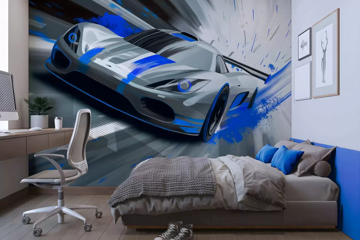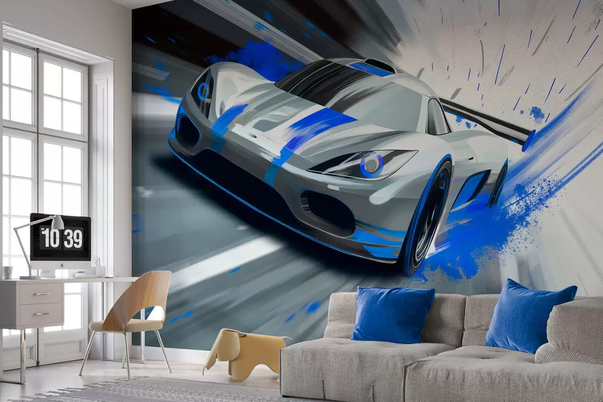 Wall murals dynamic sports car in digital drawing style with blue accents Nr. w05069
