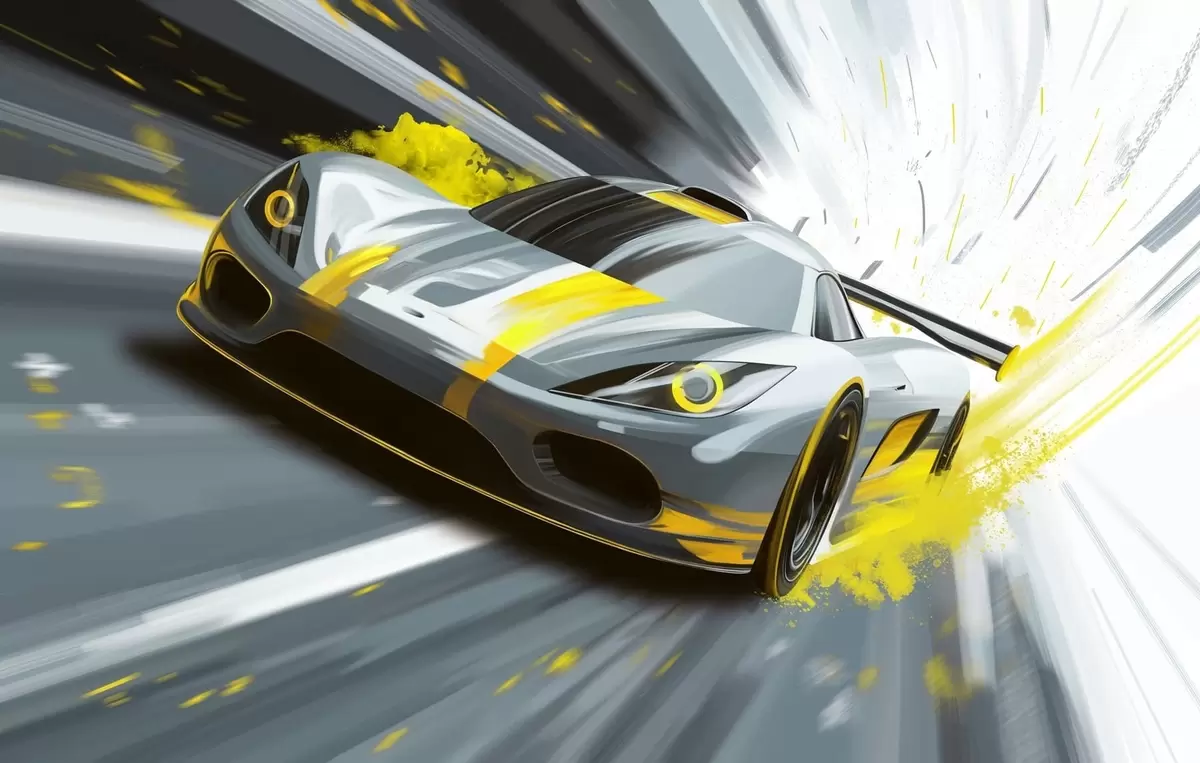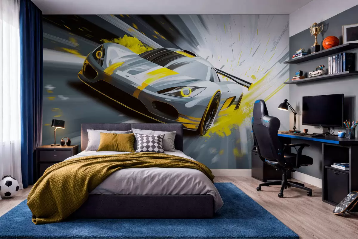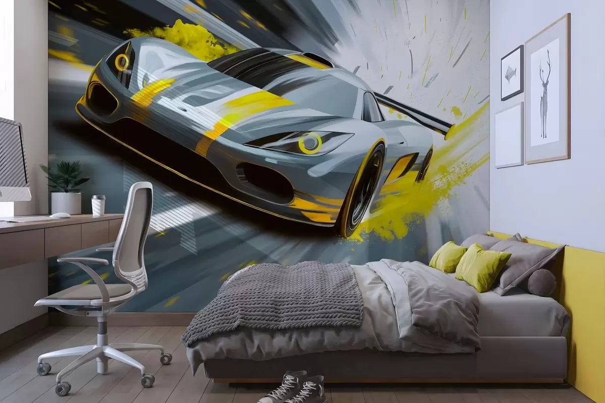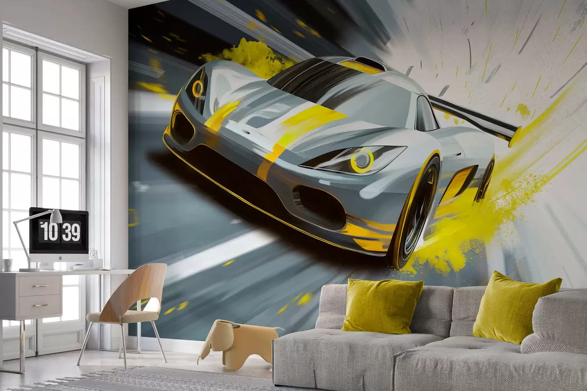 Wall murals dynamic sports car in digital drawing style with yellow accents Nr. w05069v2