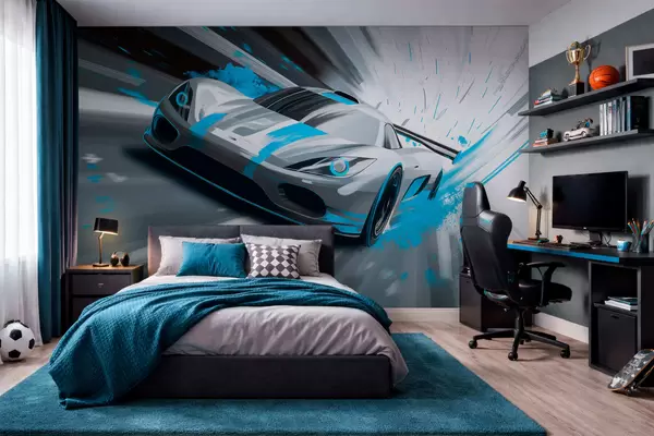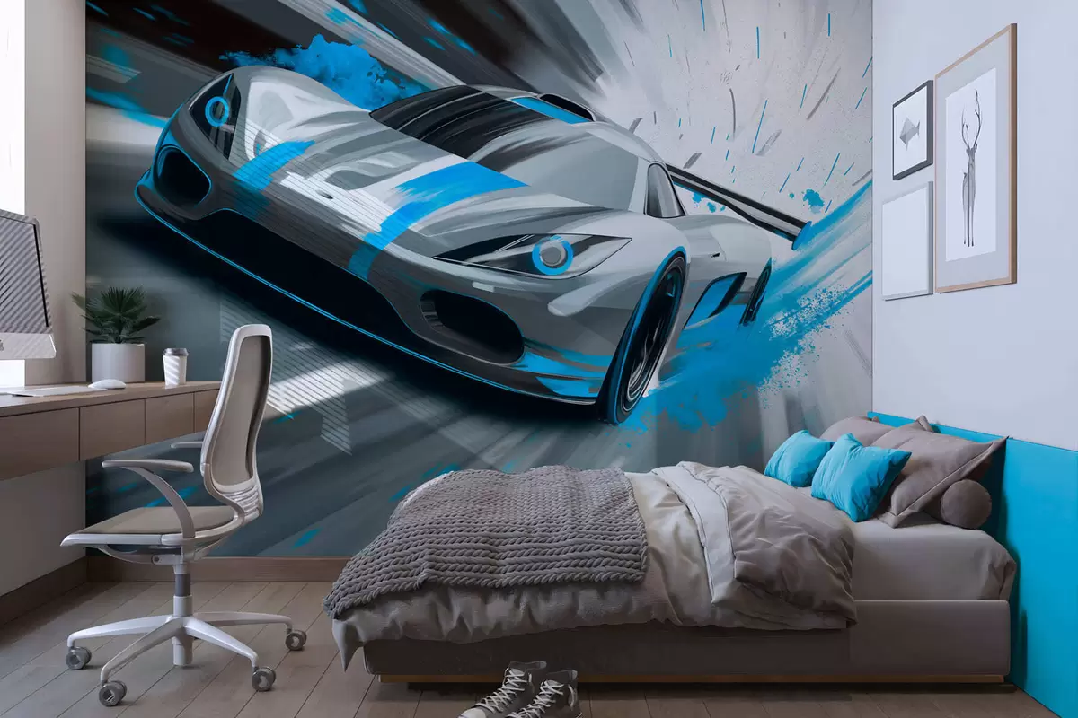 Wall murals dynamic sports car in digital drawing style with turquoise accents Nr. w05069v3