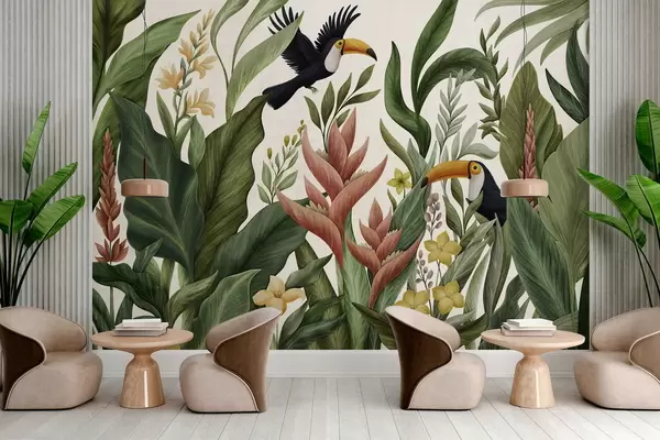 Wall murals Tropical plants and large-beaked birds on light background Nr. w05088v1