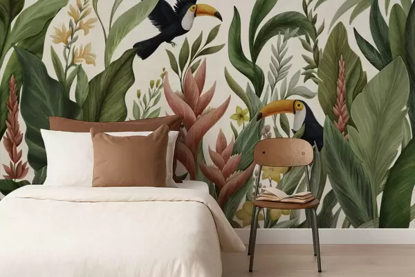 Wall murals Tropical plants and large-beaked birds on light background Nr. w05088v1
