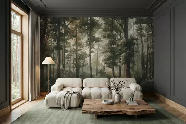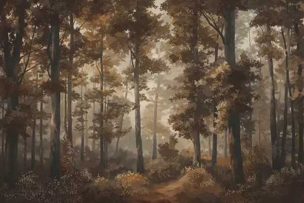 Wall murals Forest illustration with mist, tall trees and a path Nr. w05089