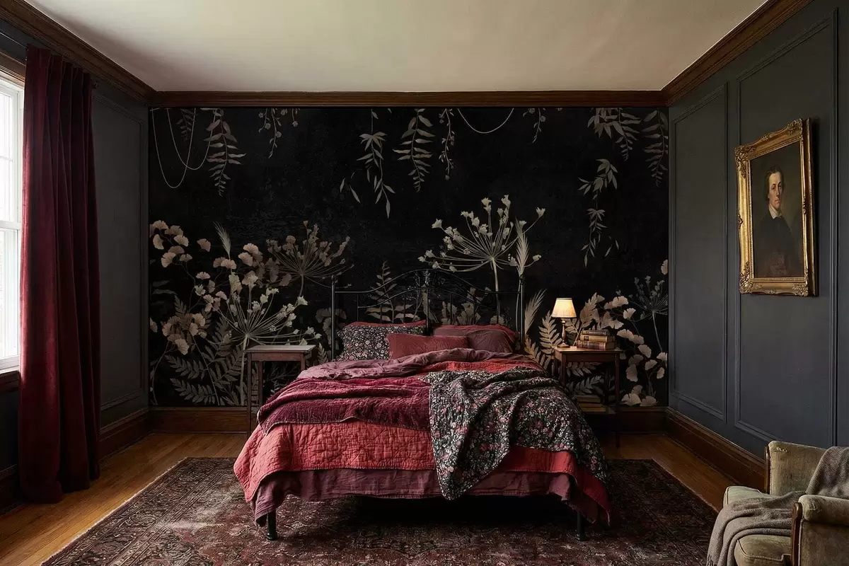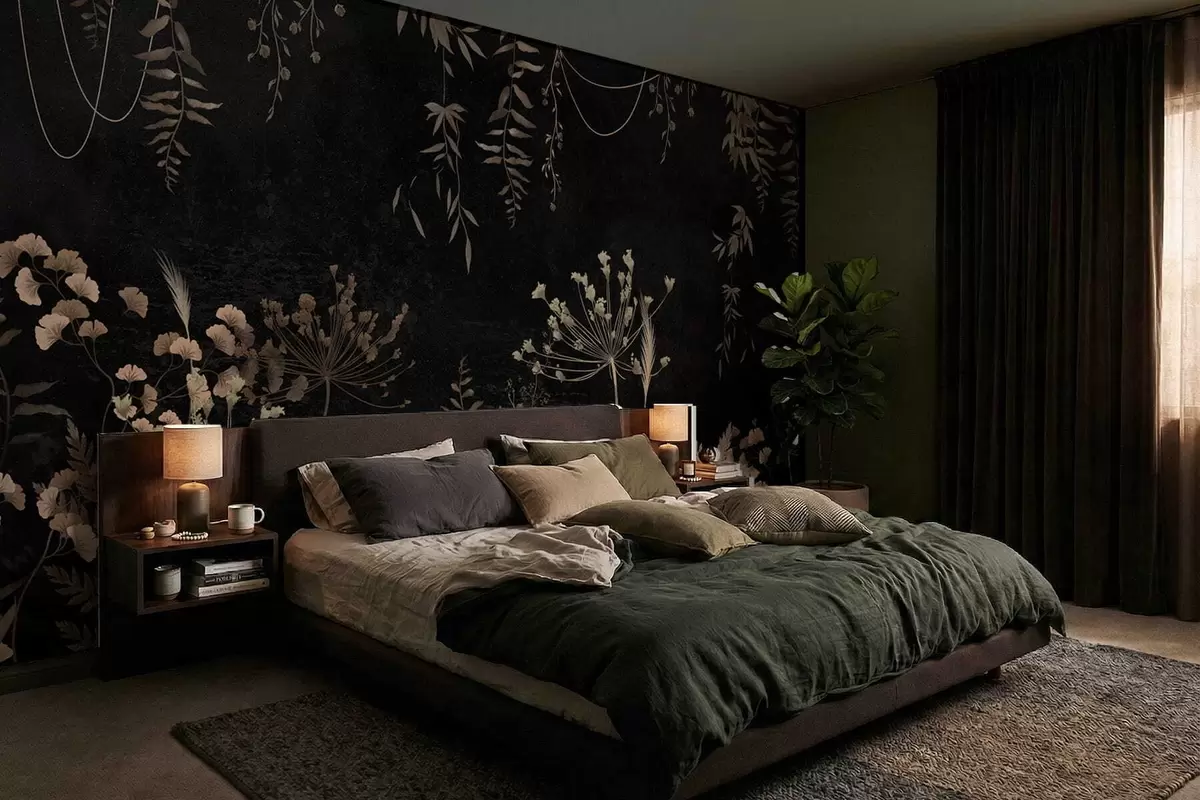 Wall murals Dark botanical pattern with flowers and leaves Nr. w05092