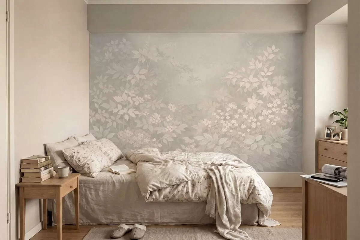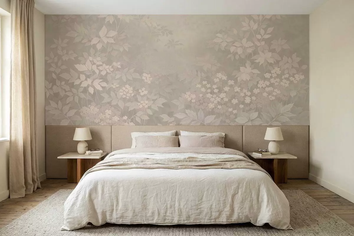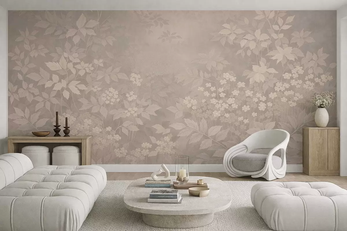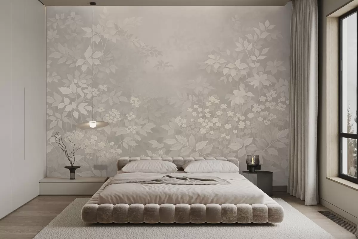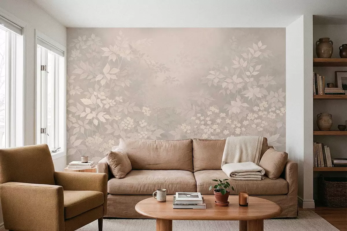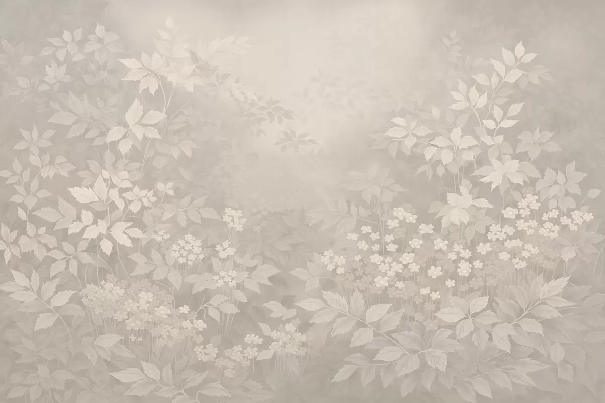 Wall murals Soft botanical pattern with leaves and flowers in mist Nr. w05115v1