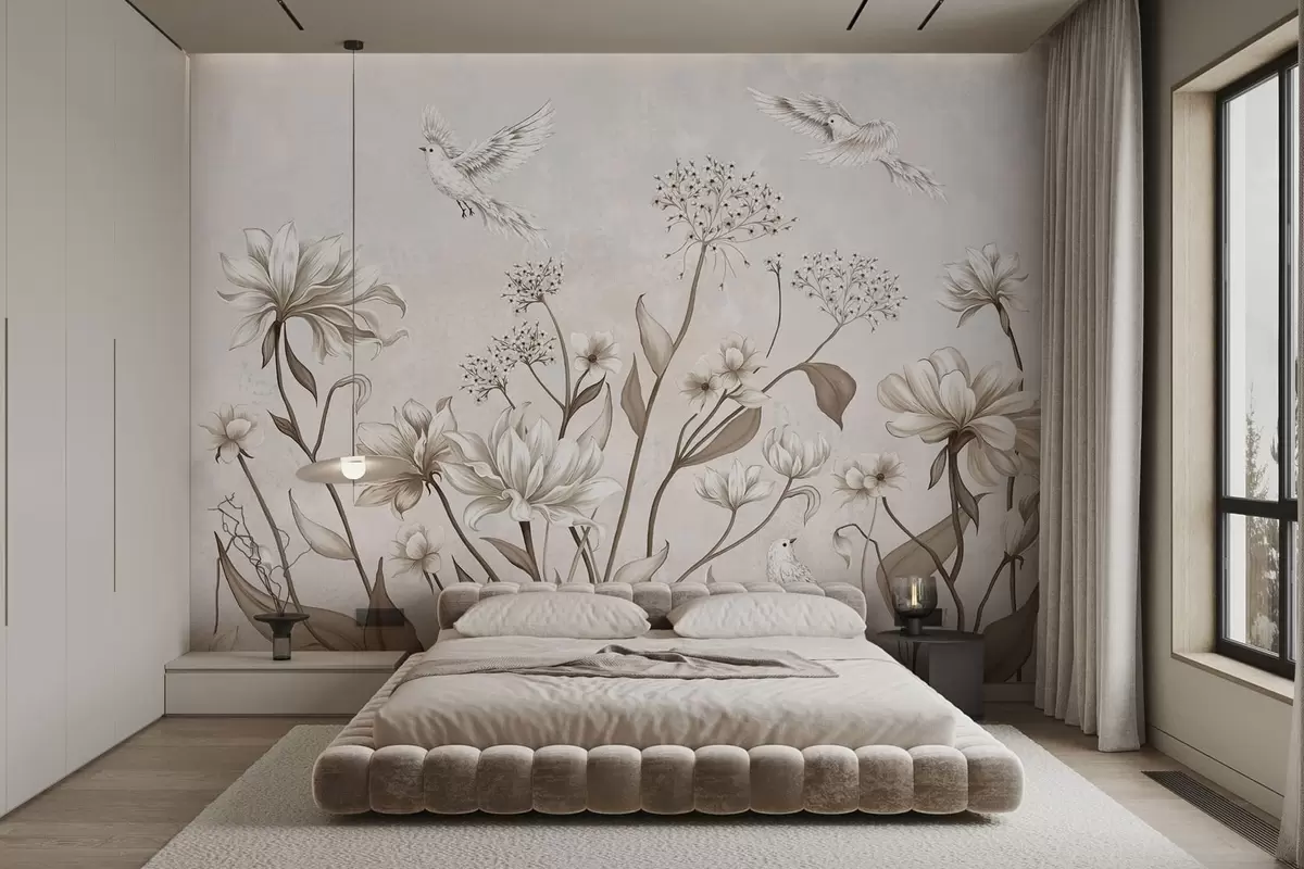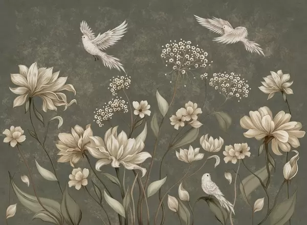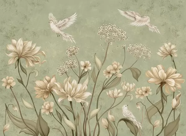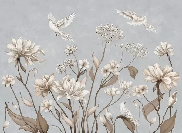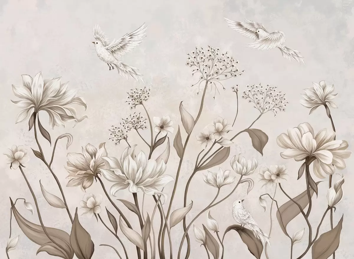 Wall murals Light flowers and birds on soft background Nr. w05118