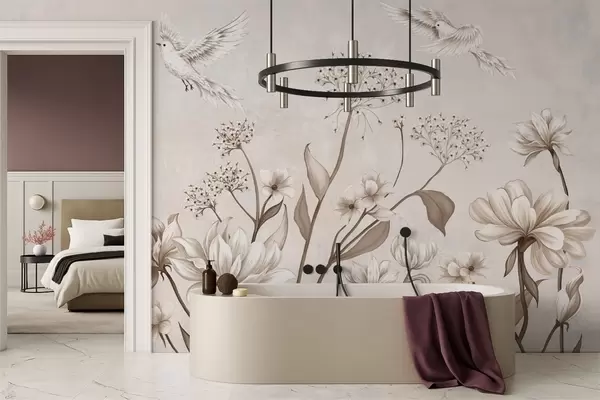 Wall murals Light flowers and birds on soft background Nr. w05118