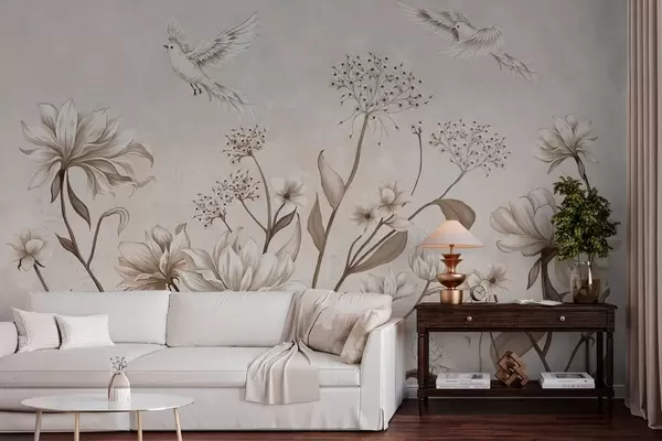 Wall murals Light flowers and birds on soft background Nr. w05118