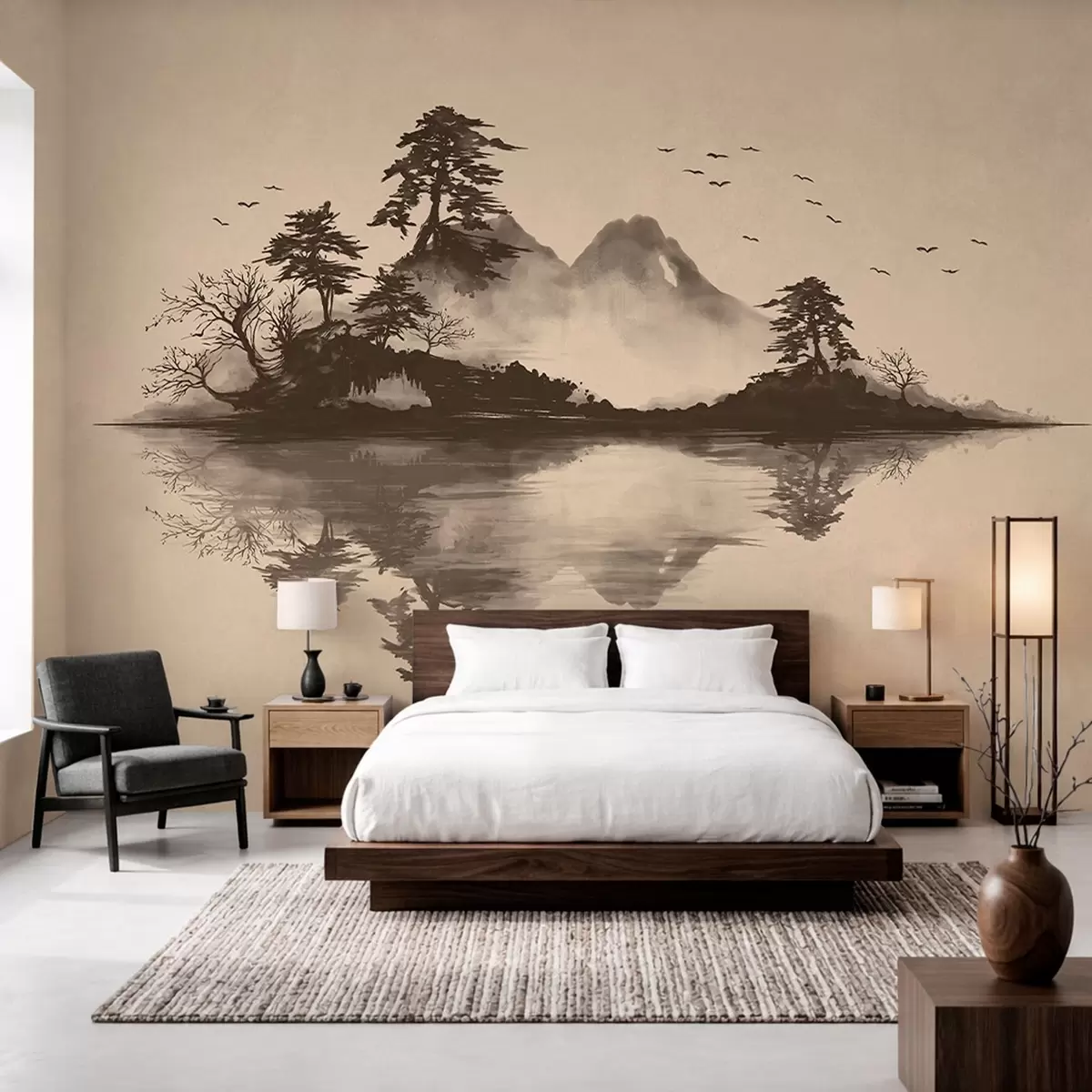 Wall murals Sumi-e mountain landscape with pines and reflection Nr. w05124