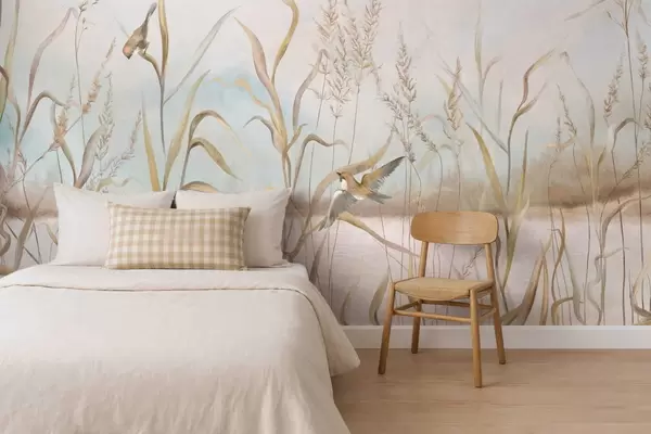 Wall murals Illustration of reeds and birds by water in soft tones Nr. w05125