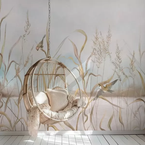 Wall murals Illustration of reeds and birds by water in soft tones Nr. w05125
