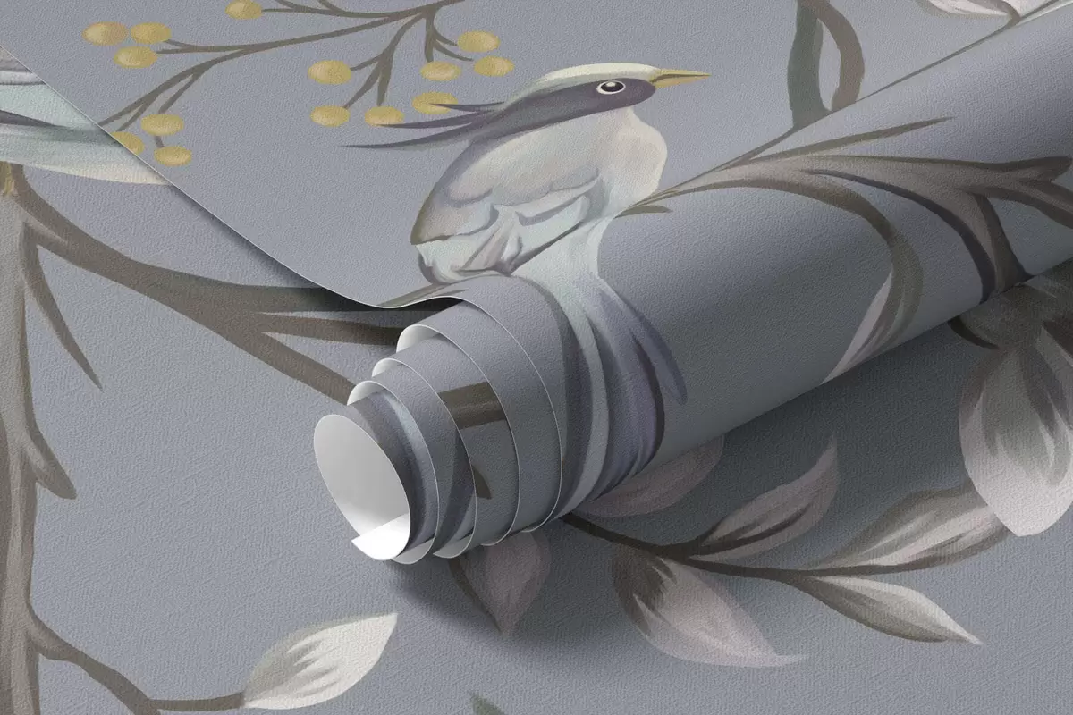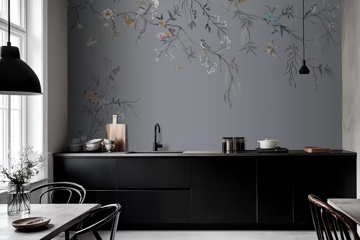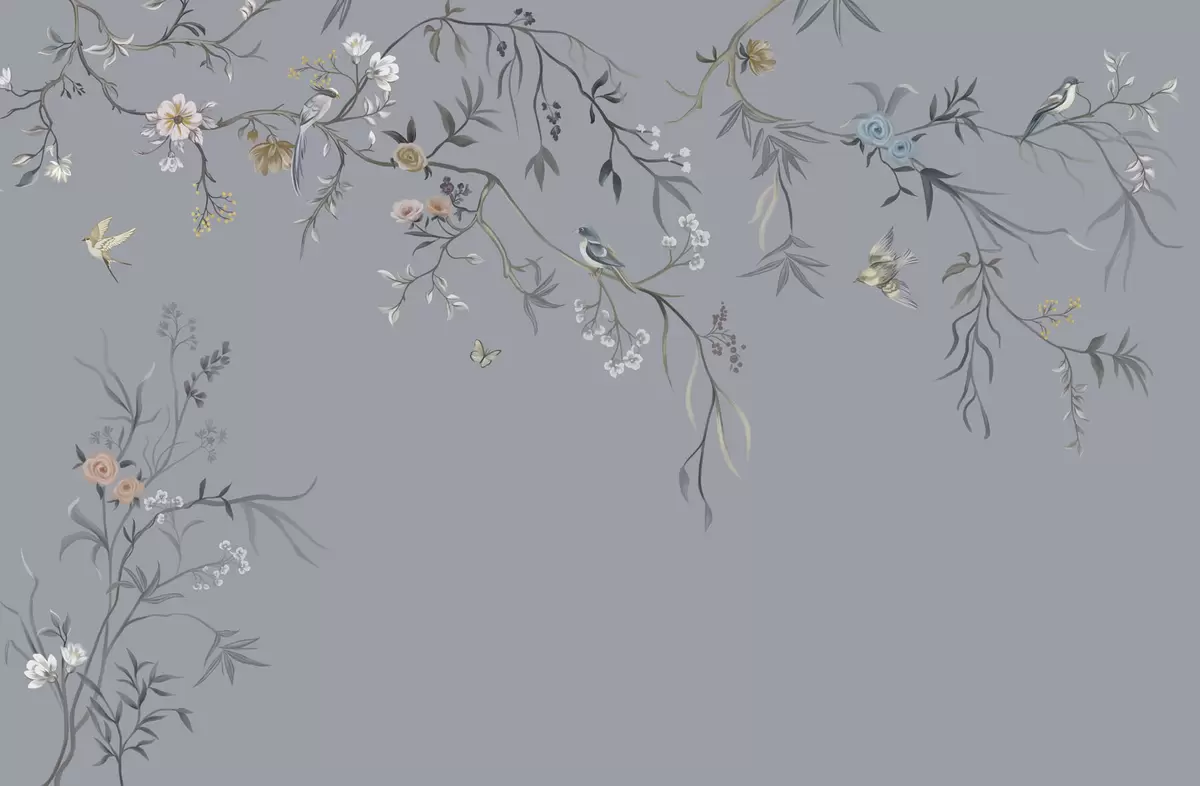 Wall murals Floral branches with birds on greenish background Nr. w05127v5