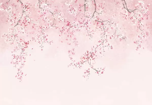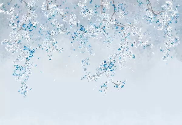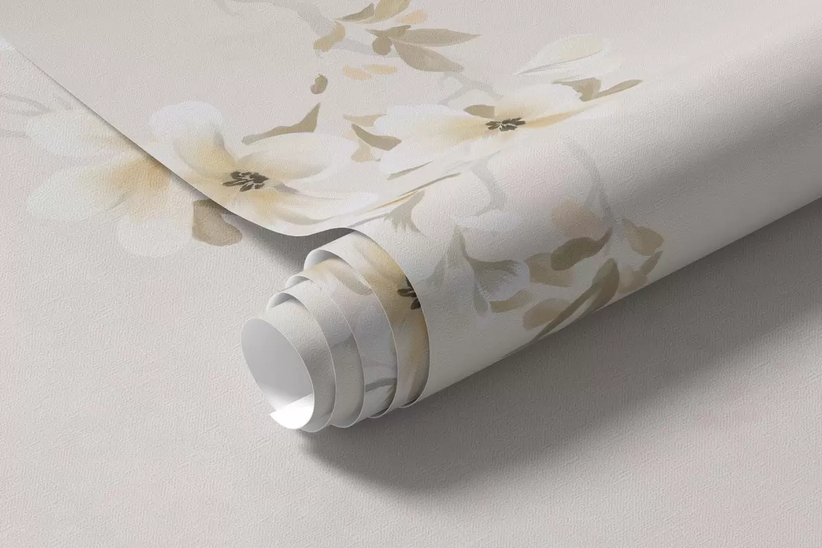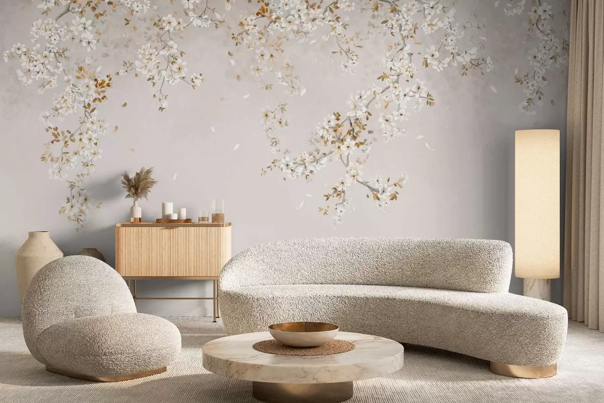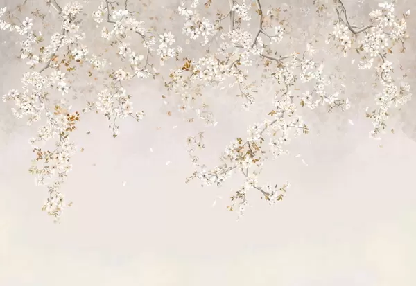 Wall murals Branches with white blossoms on a soft beige background Nr. w05129
