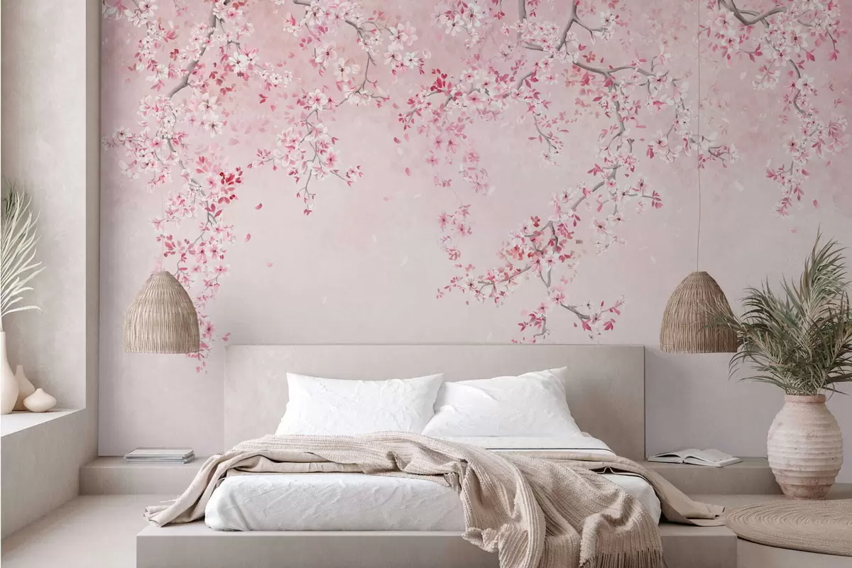 Wall murals Branches with pink blossoms on a soft pastel background Nr. w05129v1