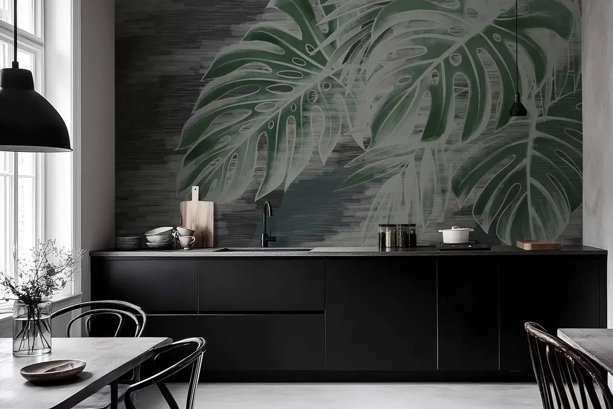 Wall murals Dark green leaves on a textured dark background Nr. w05130v4