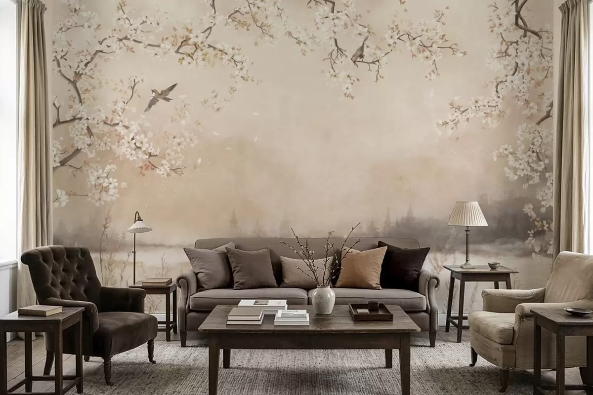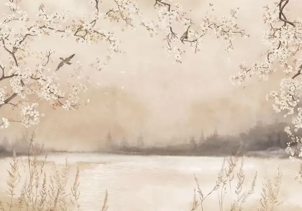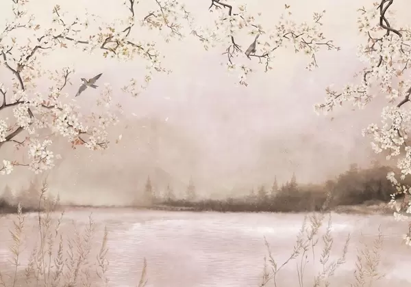 Wall murals Delicate blooming branches by lake with birds in light mist Nr. w05155