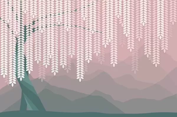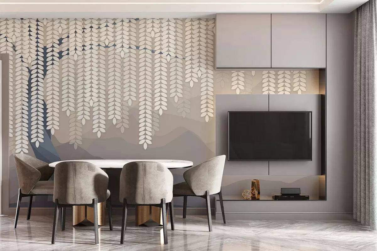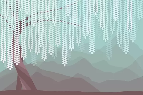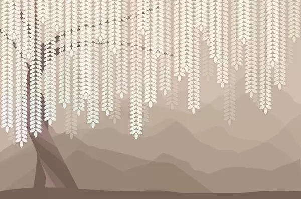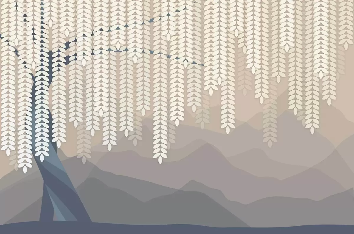 Wall murals stylised willow tree with hanging leaves against a backdrop of minimalist mountains in shades of beige and blue-green Nr. w05232