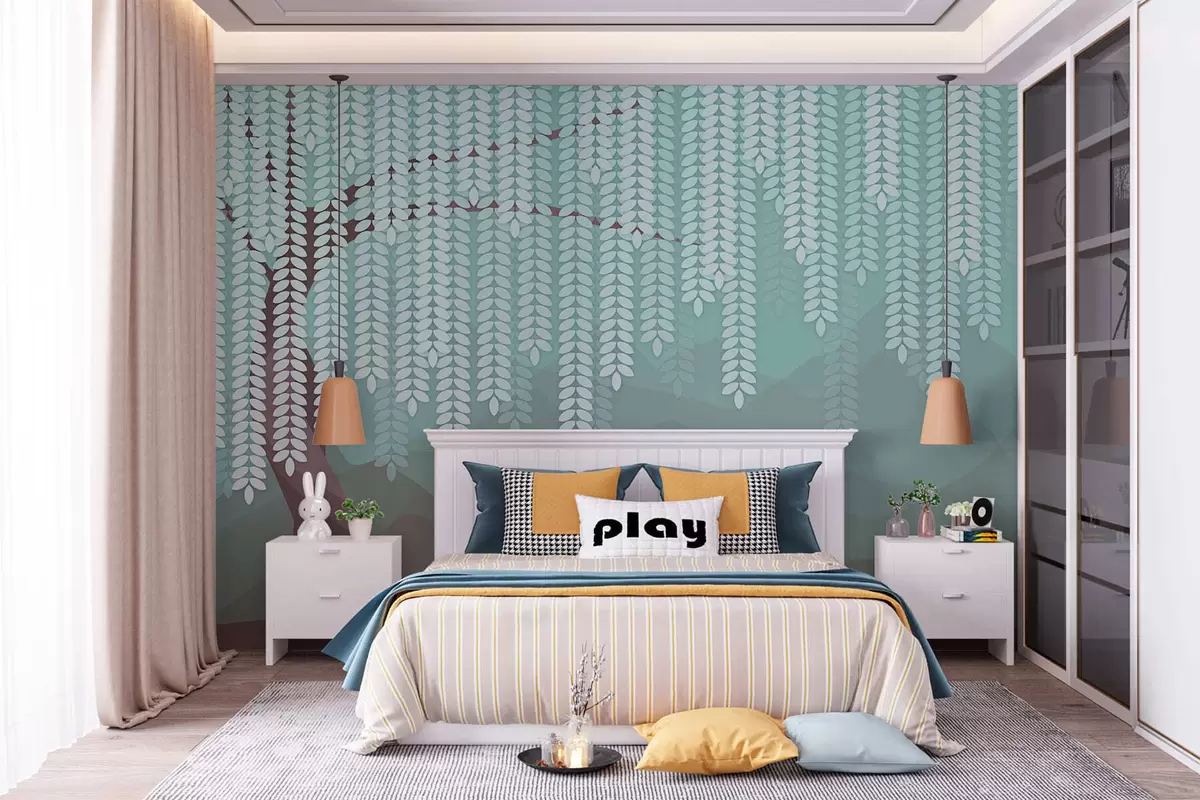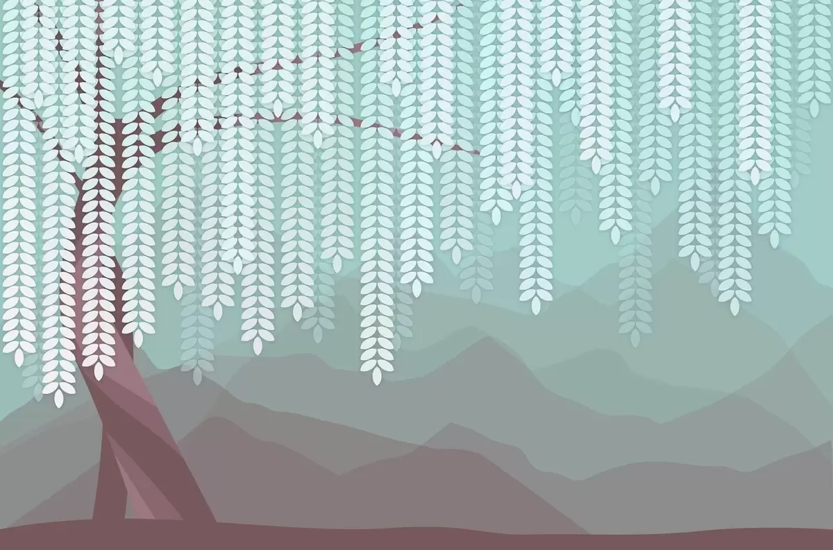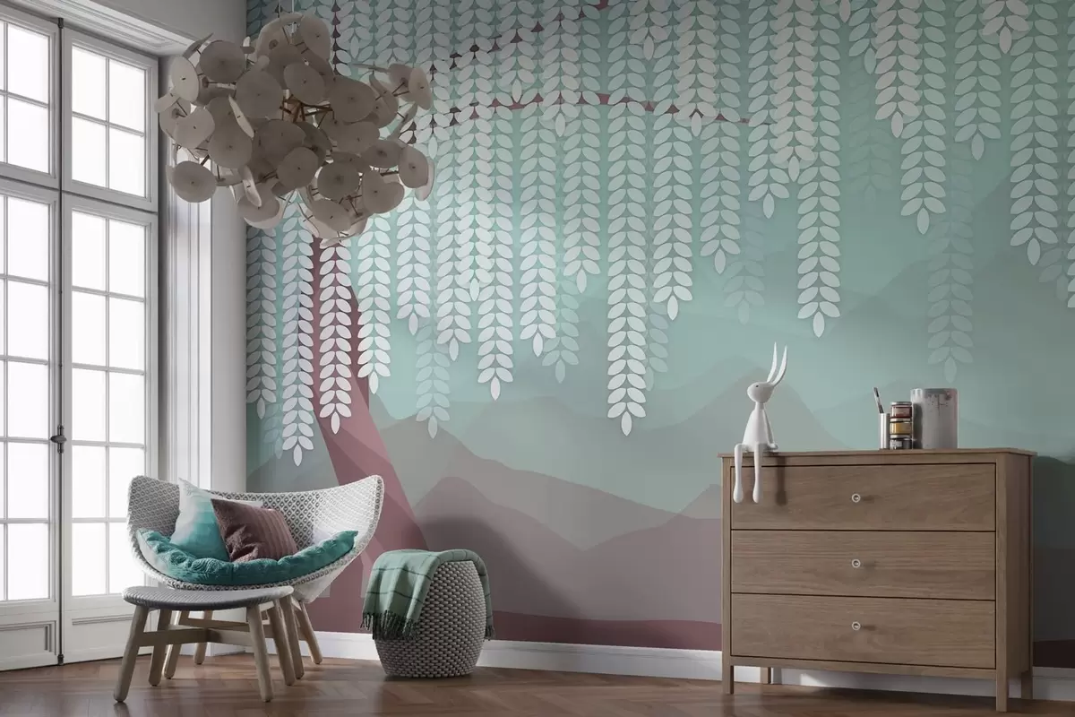Wall murals stylised willow tree with hanging leaves against a backdrop of minimalist mountains in shades of chocolate and turquoise Nr. w05232v1