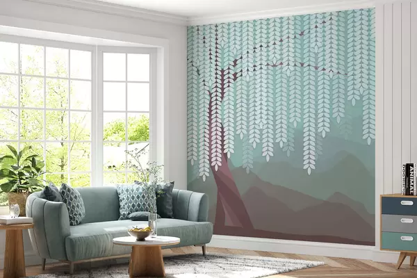 Wall murals stylised willow tree with hanging leaves against a backdrop of minimalist mountains in shades of chocolate and turquoise Nr. w05232v1