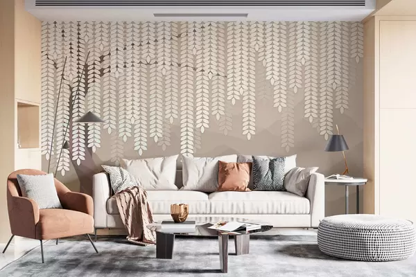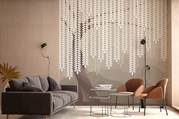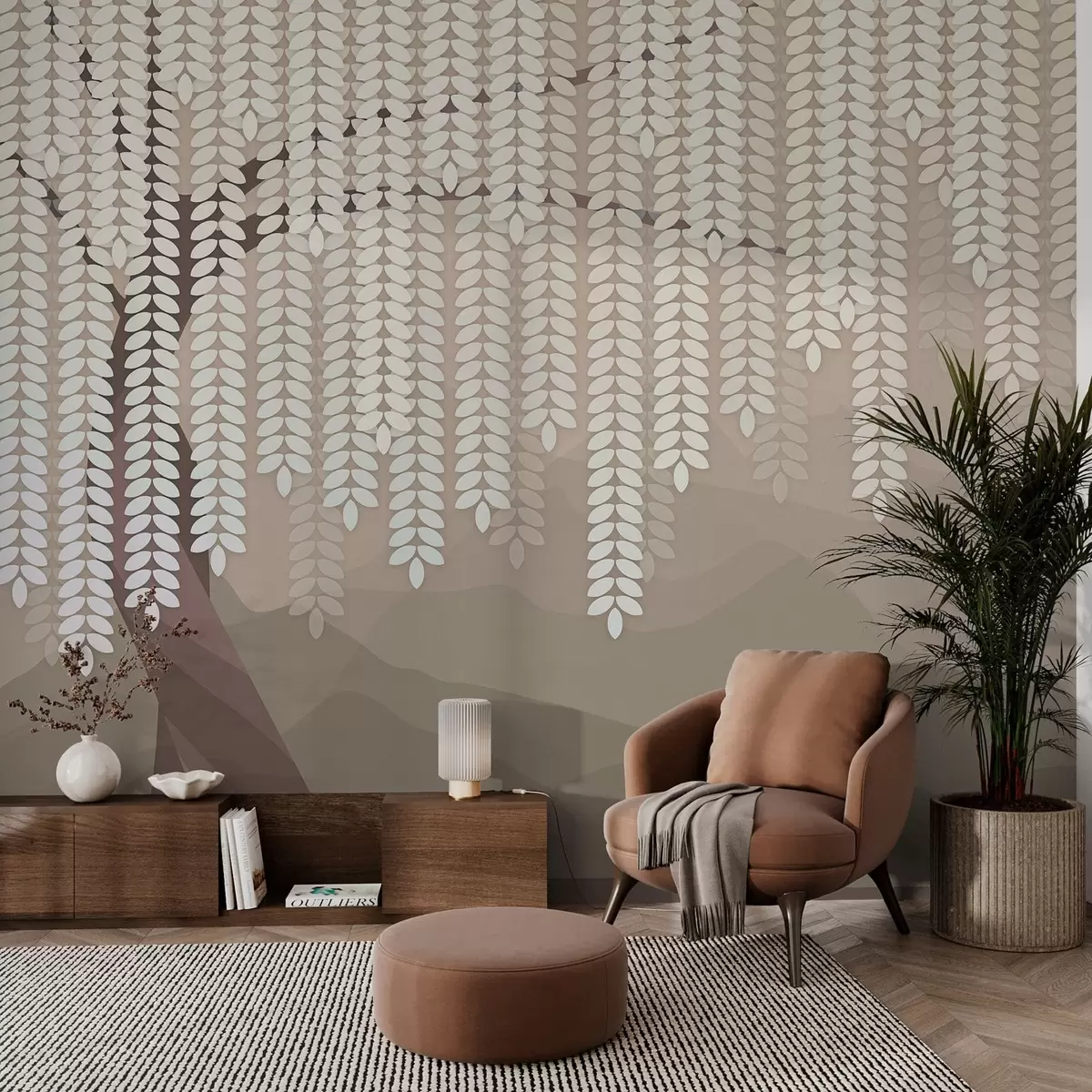 Wall murals stylised willow tree with hanging leaves against a backdrop of minimalist mountains in shades of coffee Nr. w05232v2