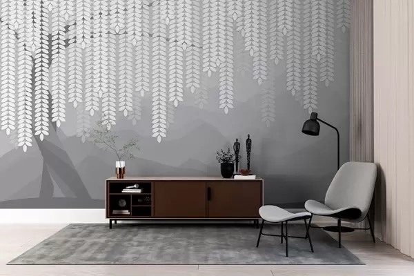 Wall murals stylised willow tree with hanging leaves against a backdrop of minimalist mountains in shades of grey Nr. w05232v3