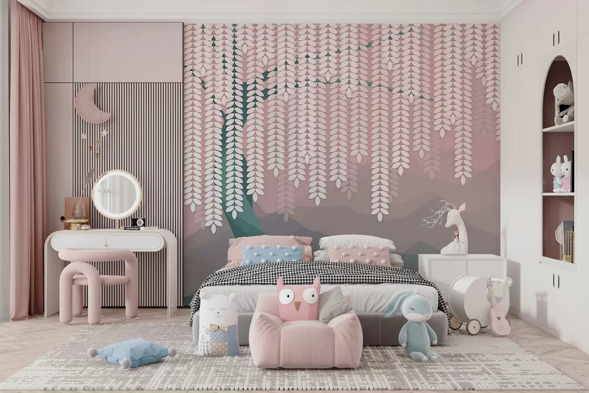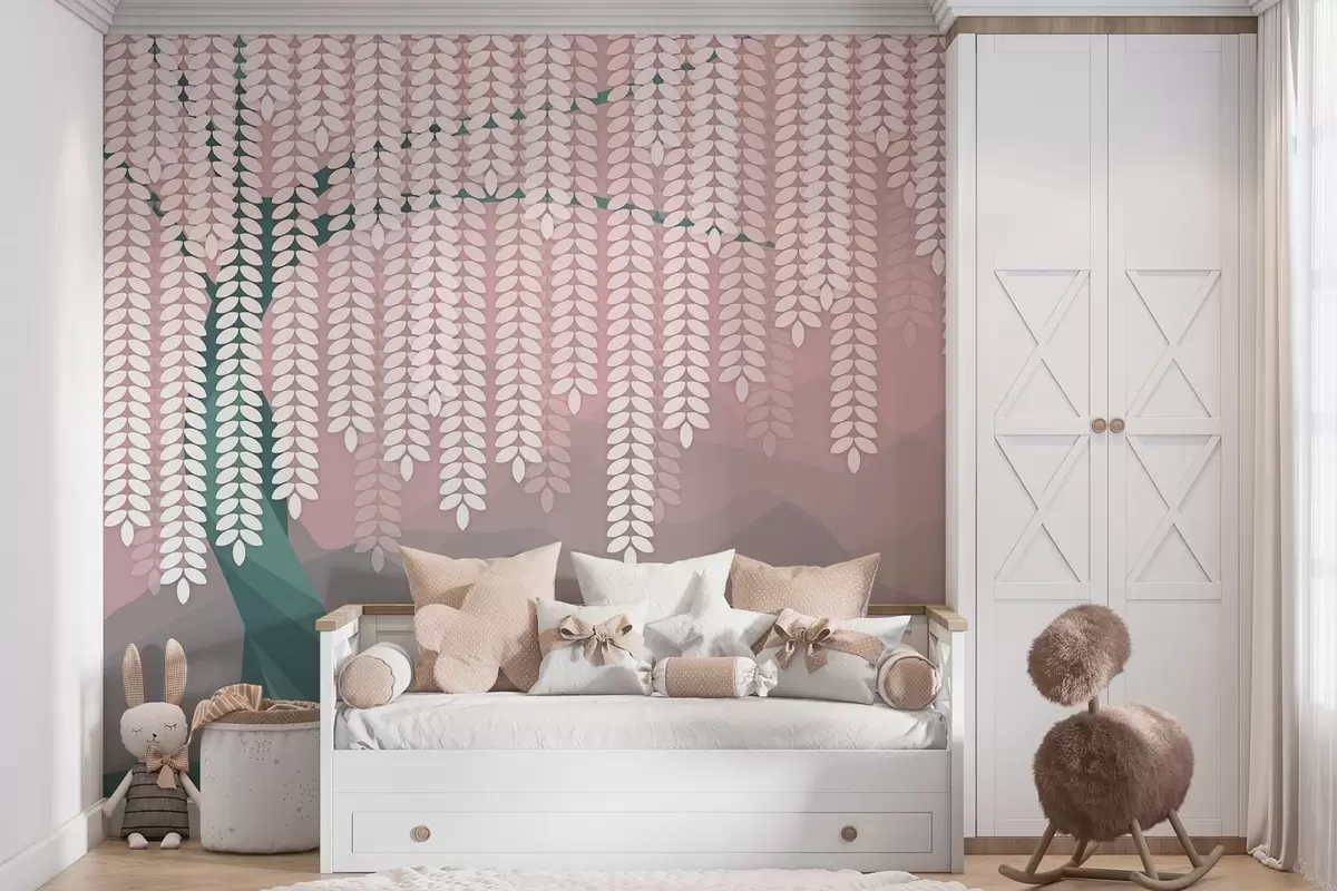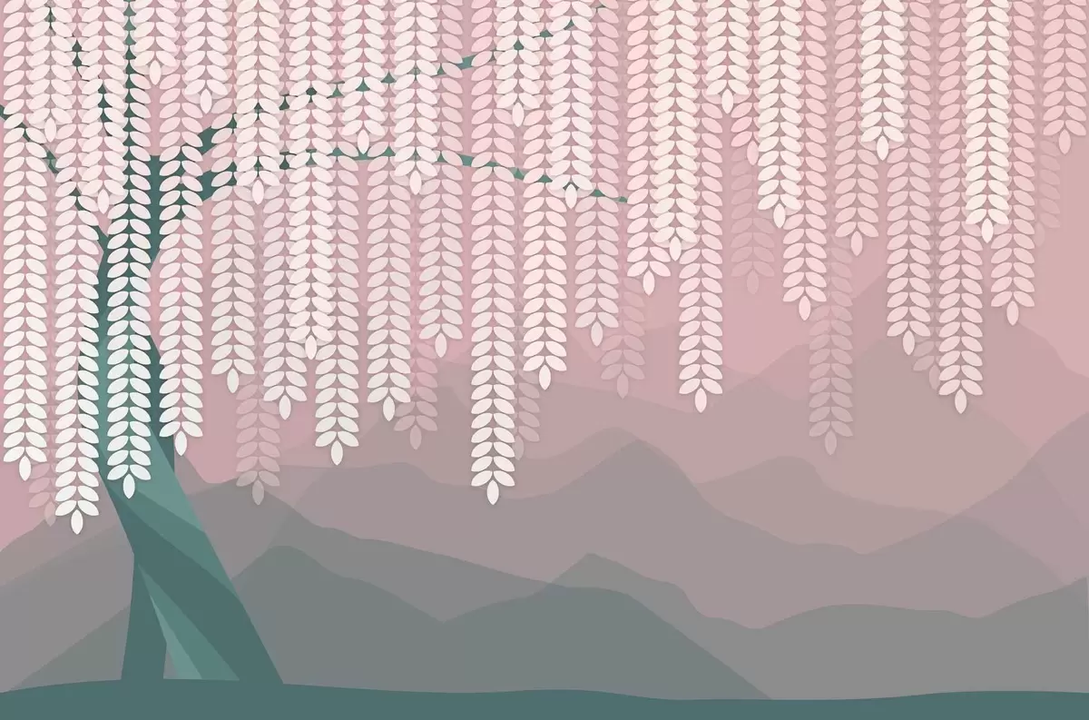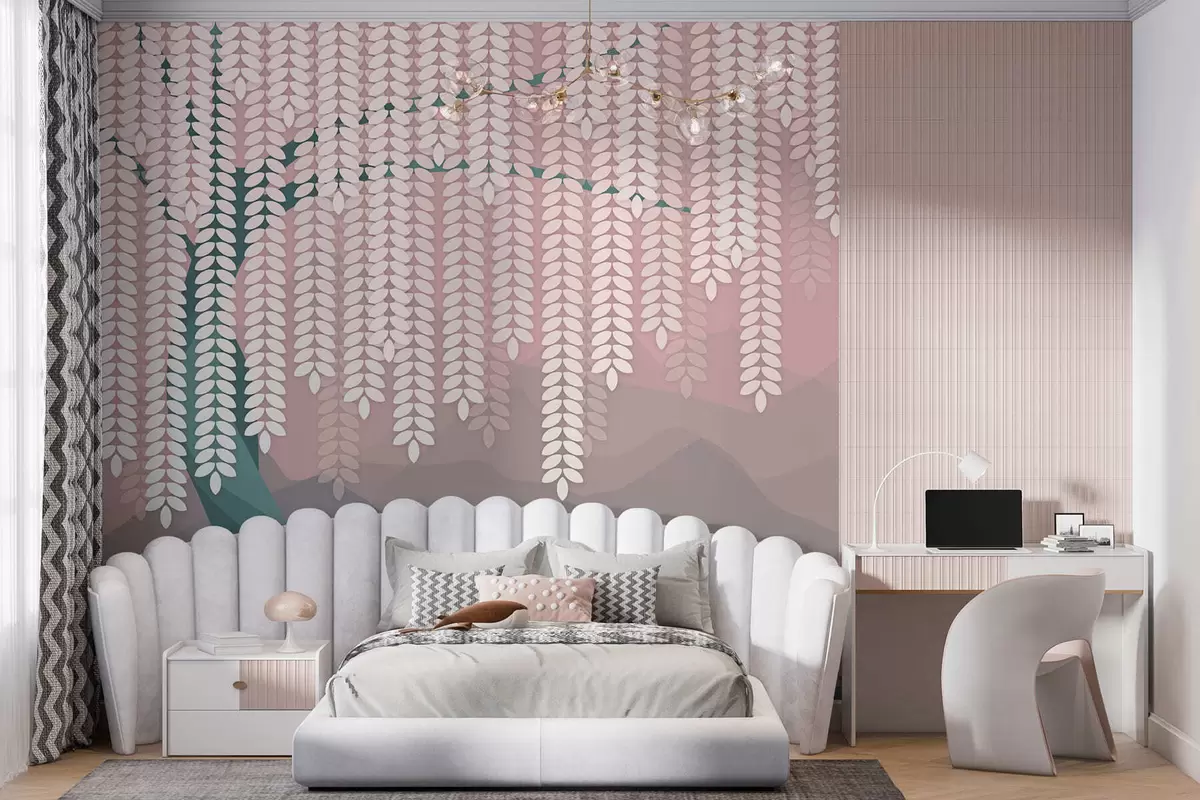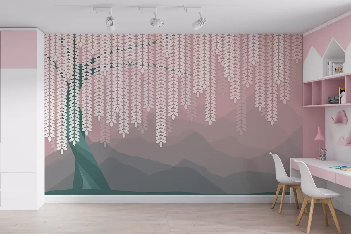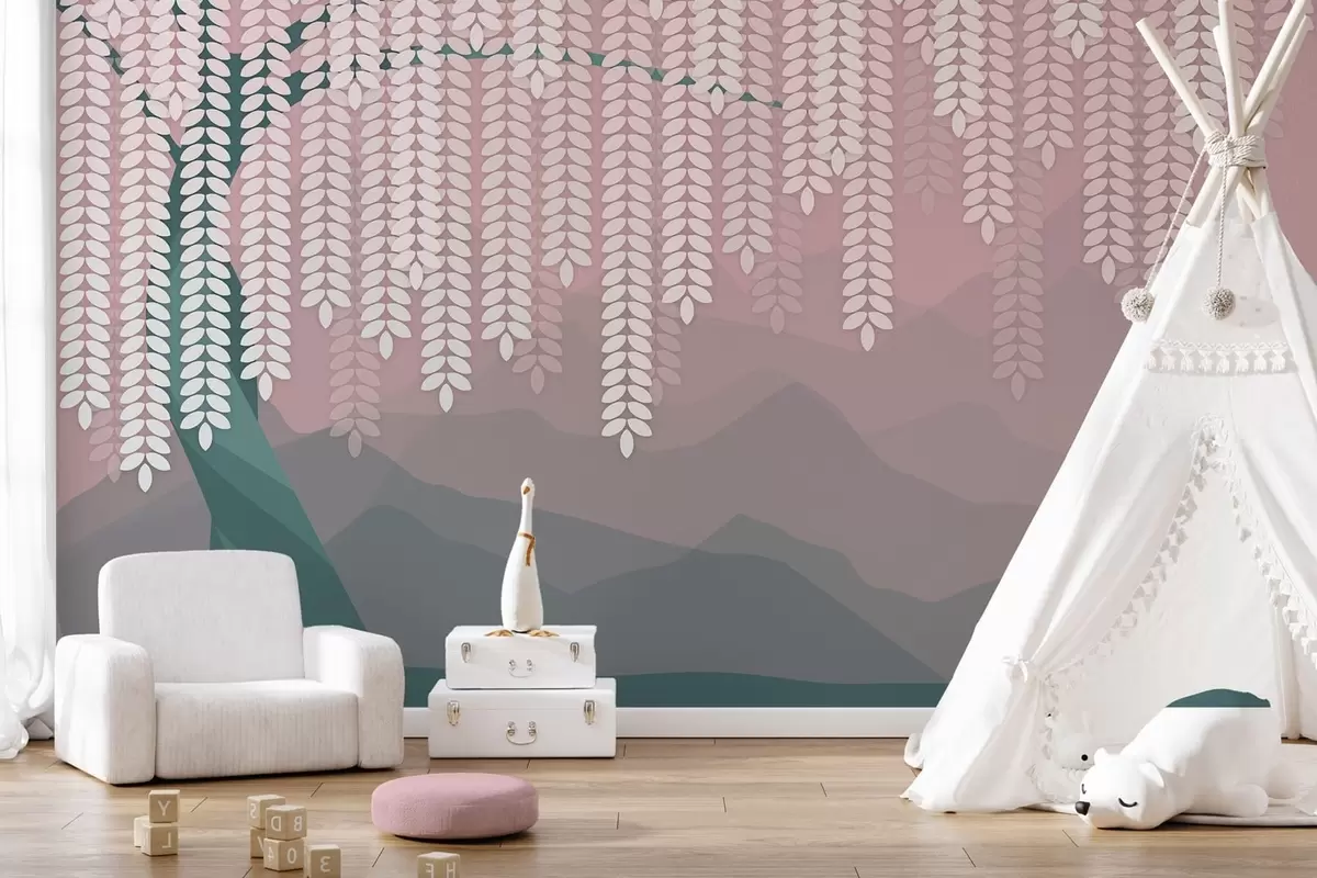 Wall murals stylised willow tree with hanging leaves against a backdrop of minimalist mountains in shades of pink and dark green Nr. w05232v4
