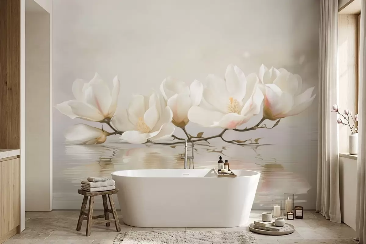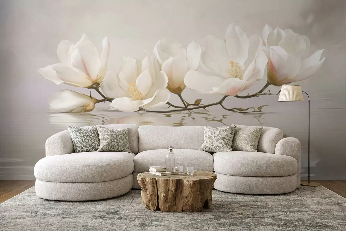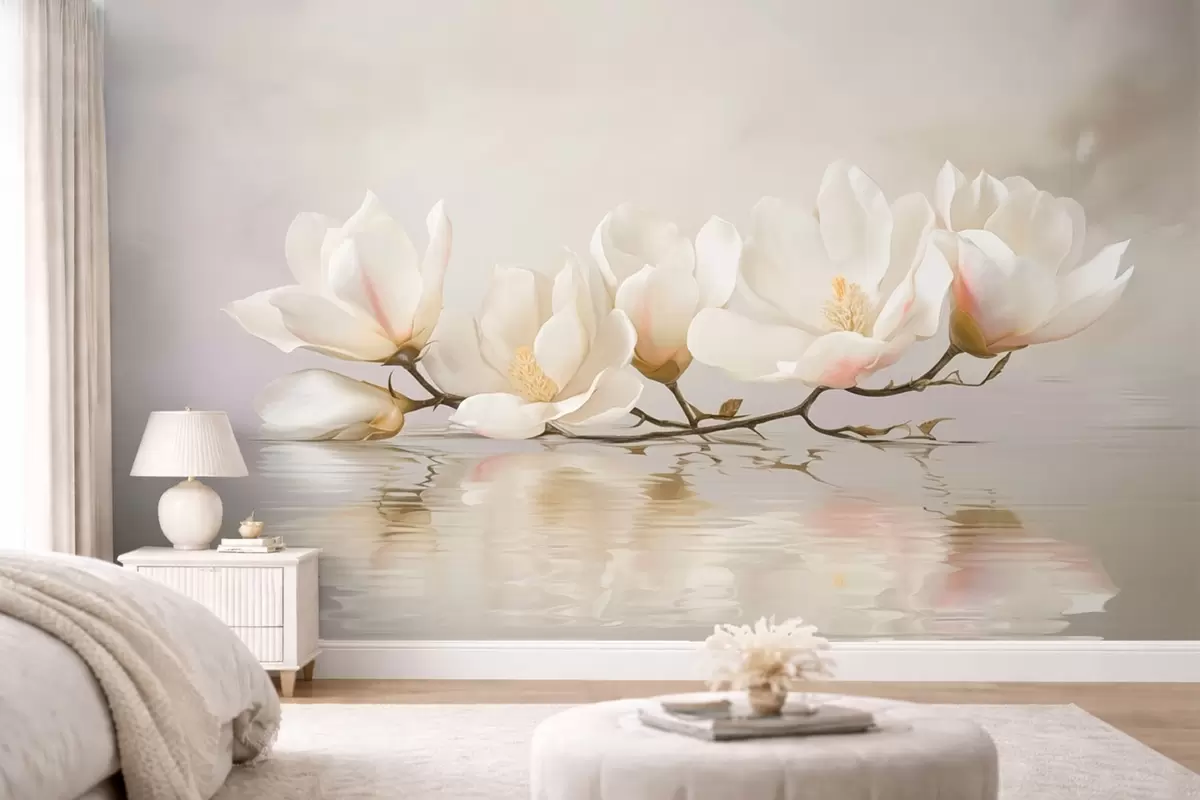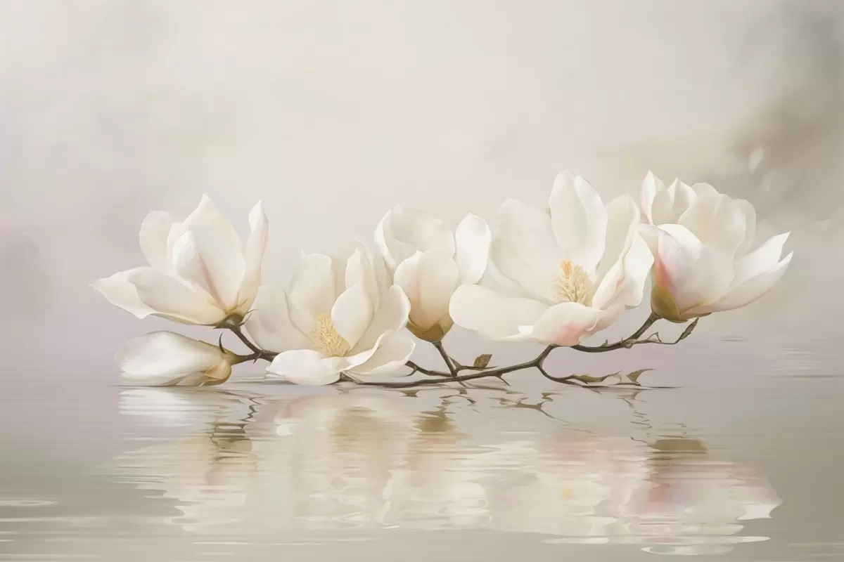 Wall murals Light magnolia blossoms on branch above water reflection Nr. w05353