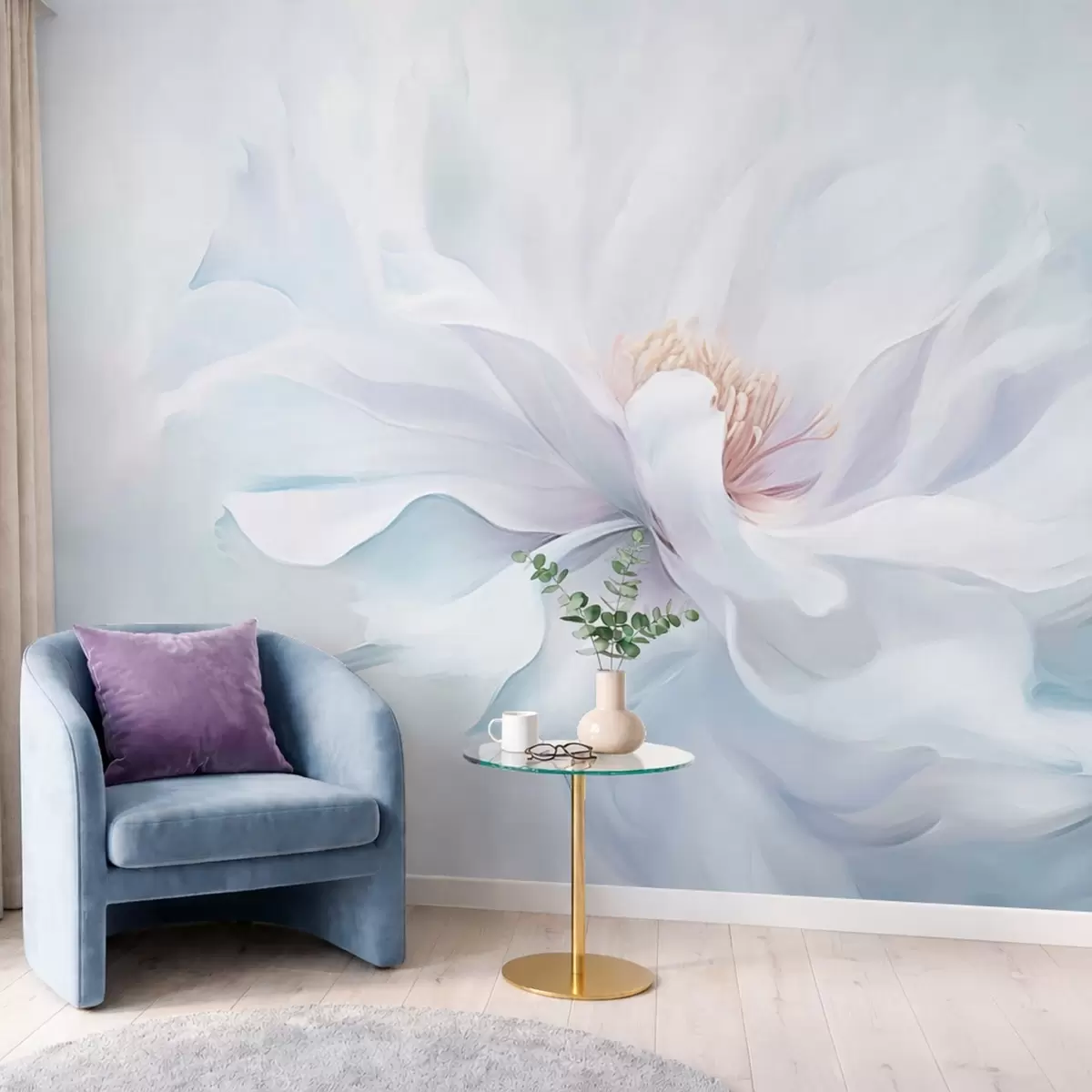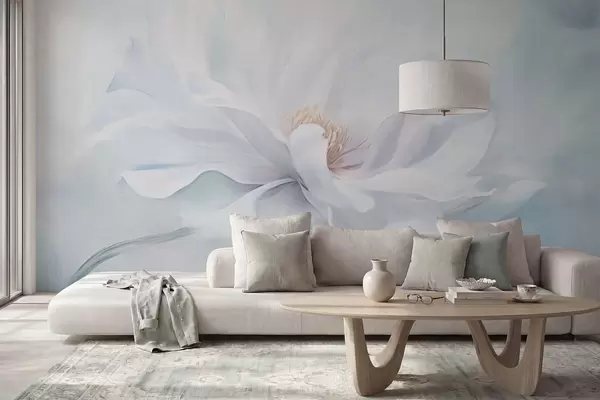Wall murals Soft white flower with flowing petals on blue background Nr. w05354