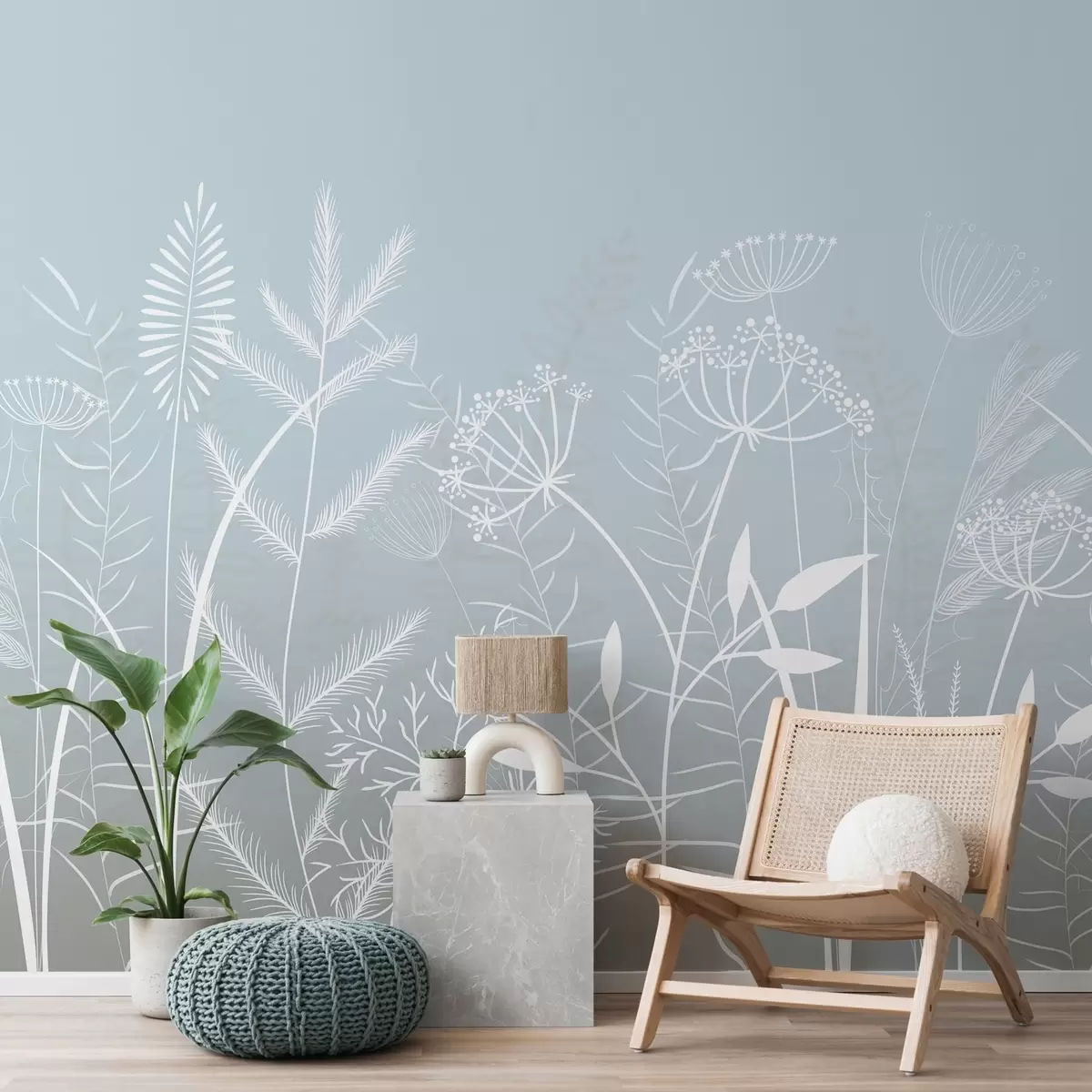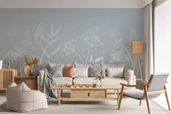 Wall murals delicate hand-painted wild grasses and flowers against a grey-blue background Nr. w05383