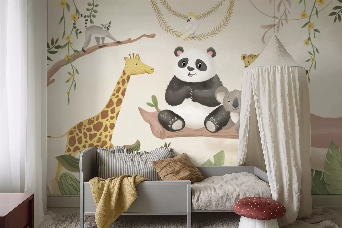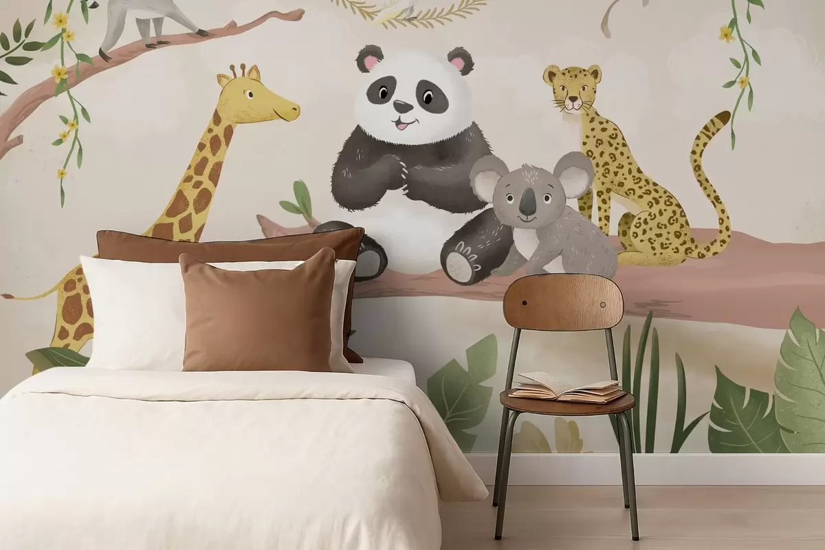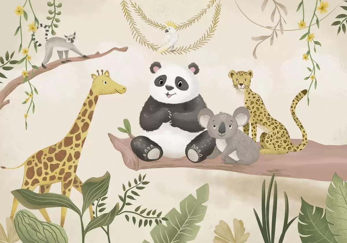 Wall murals Cute jungle animals on a branch among plants Nr. w05393