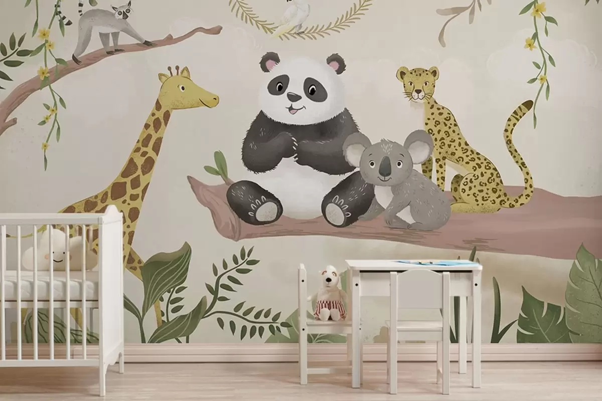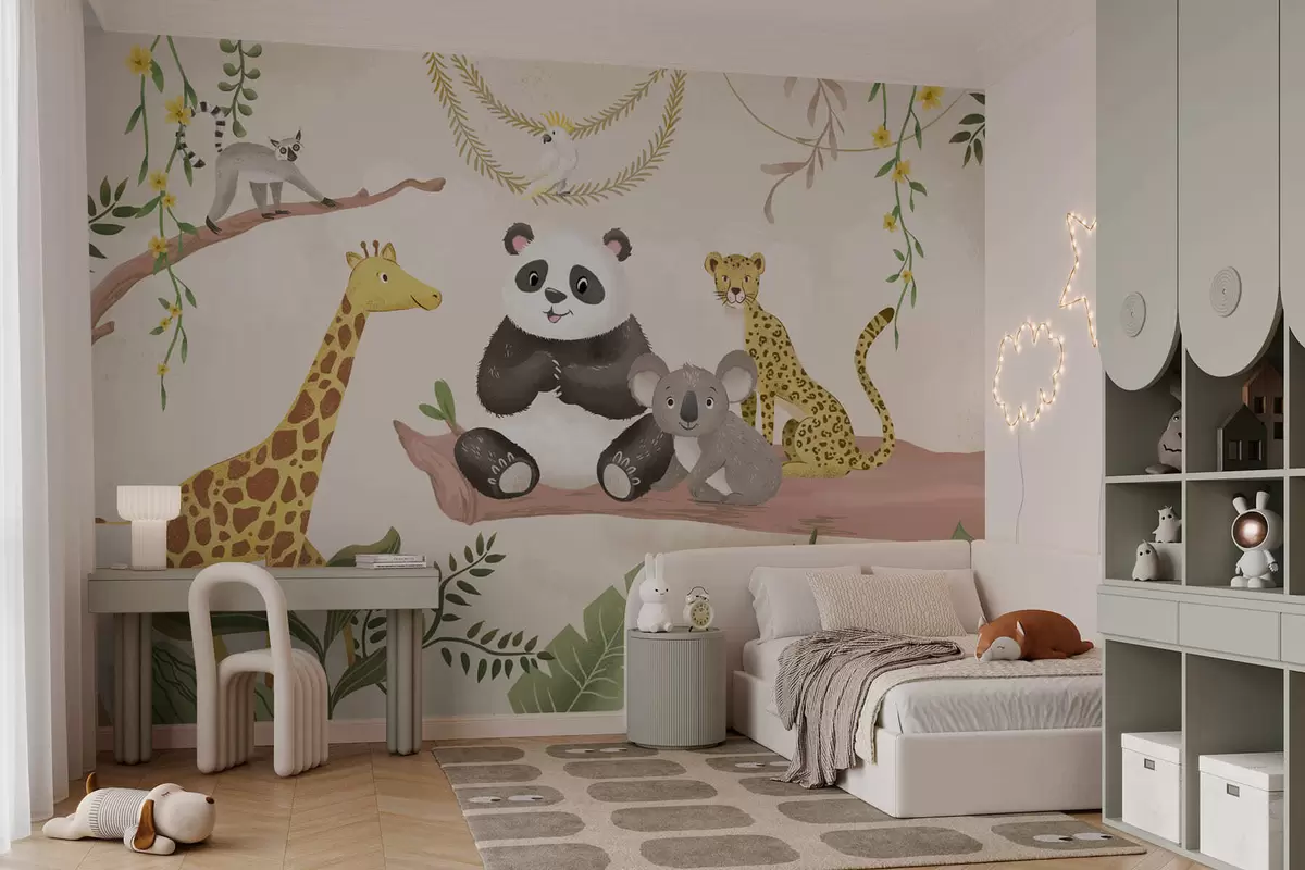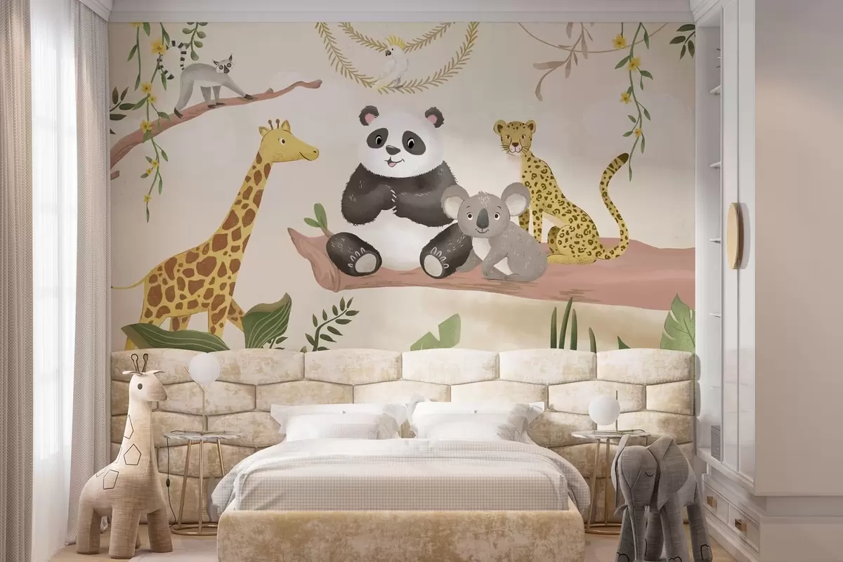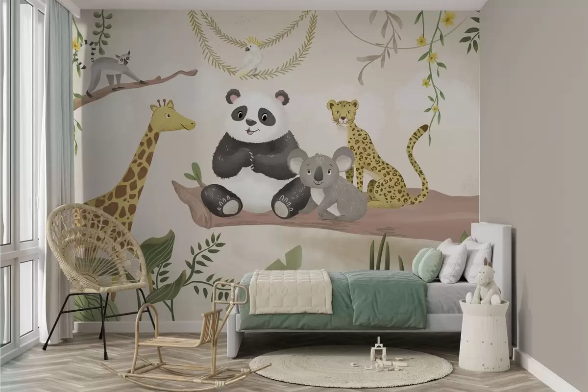 Wall murals Cute jungle animals on a branch among plants Nr. w05393