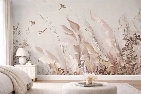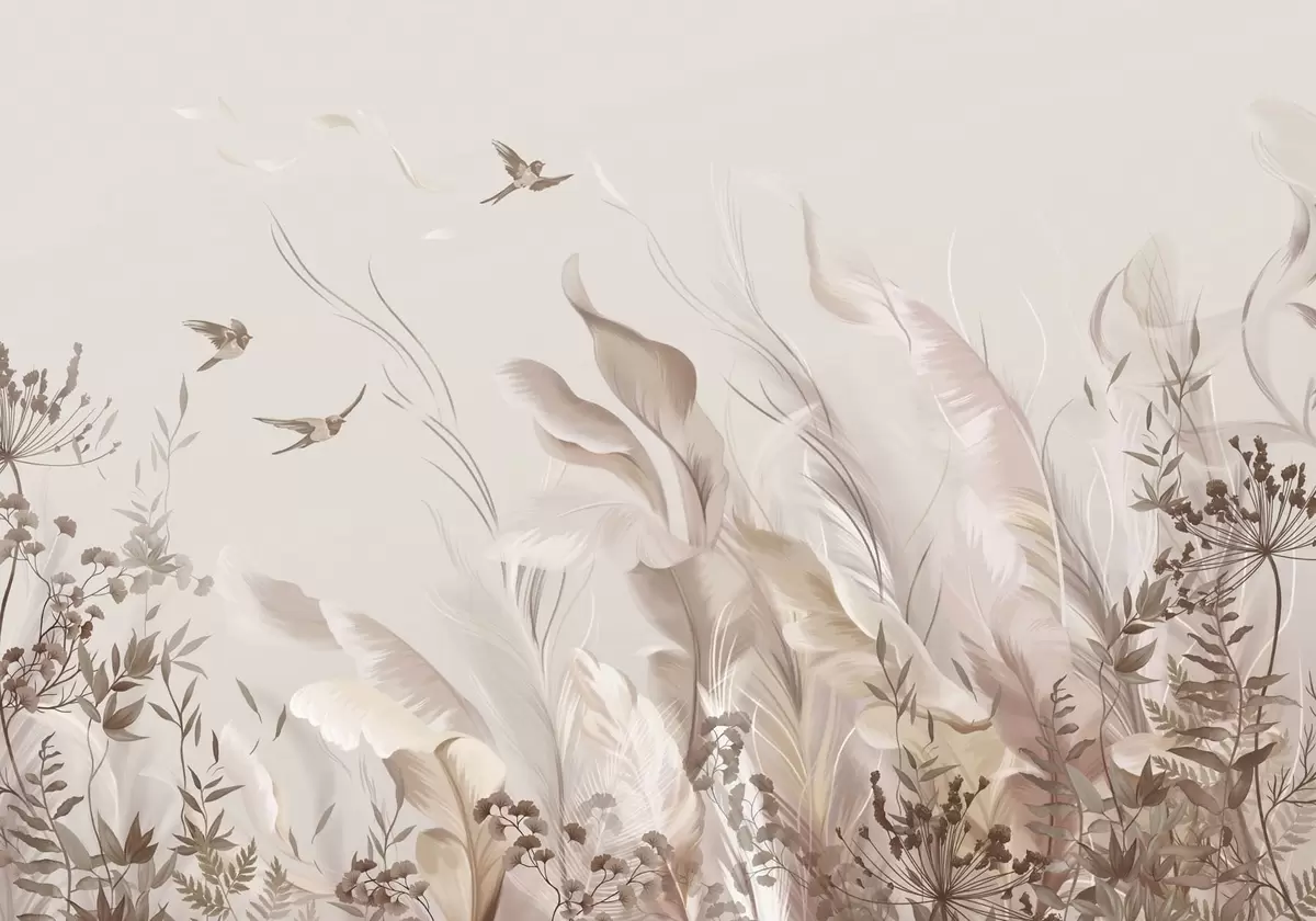 Wall murals Soft feathers, grasses and birds in light tones Nr. w05395
